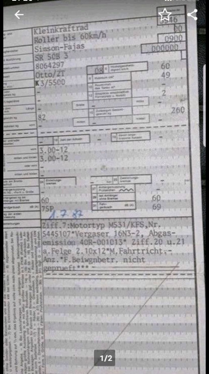 Darunter habe ich eine Kopie von einer S53M Baujahr 94, ungetragen auf Kleinkraftrad mit 60km/h, vom ein SR4-1 mit 60km/h.