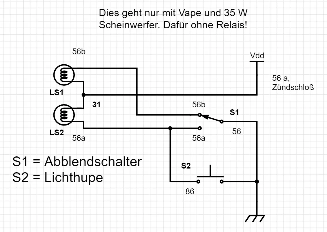 Egal, zu diesem Schaltplan. Der ist NUR für Vape mit 35W HS1 Scheinwerfer. Da hab ich ein wenig Kreativität walten lassen und das ganze System auf den Kopf gestellt. Im Grunde kriegt der alte Masseanschluss an der Birne jetzt "+" und die jeweiligen Glühfäden werden auf Masse geschaltet. Beim Einsatz der Lichthupe werden BEIDE Glühfäden eingeschaltet! Das kann die Vape nur bei 35W leisten, deshalb sollte bei H4 oder standard 12V Anlage ein Relais eingebaut werden. Diese Pläne kommen dann auch in den nächsten Tagen.