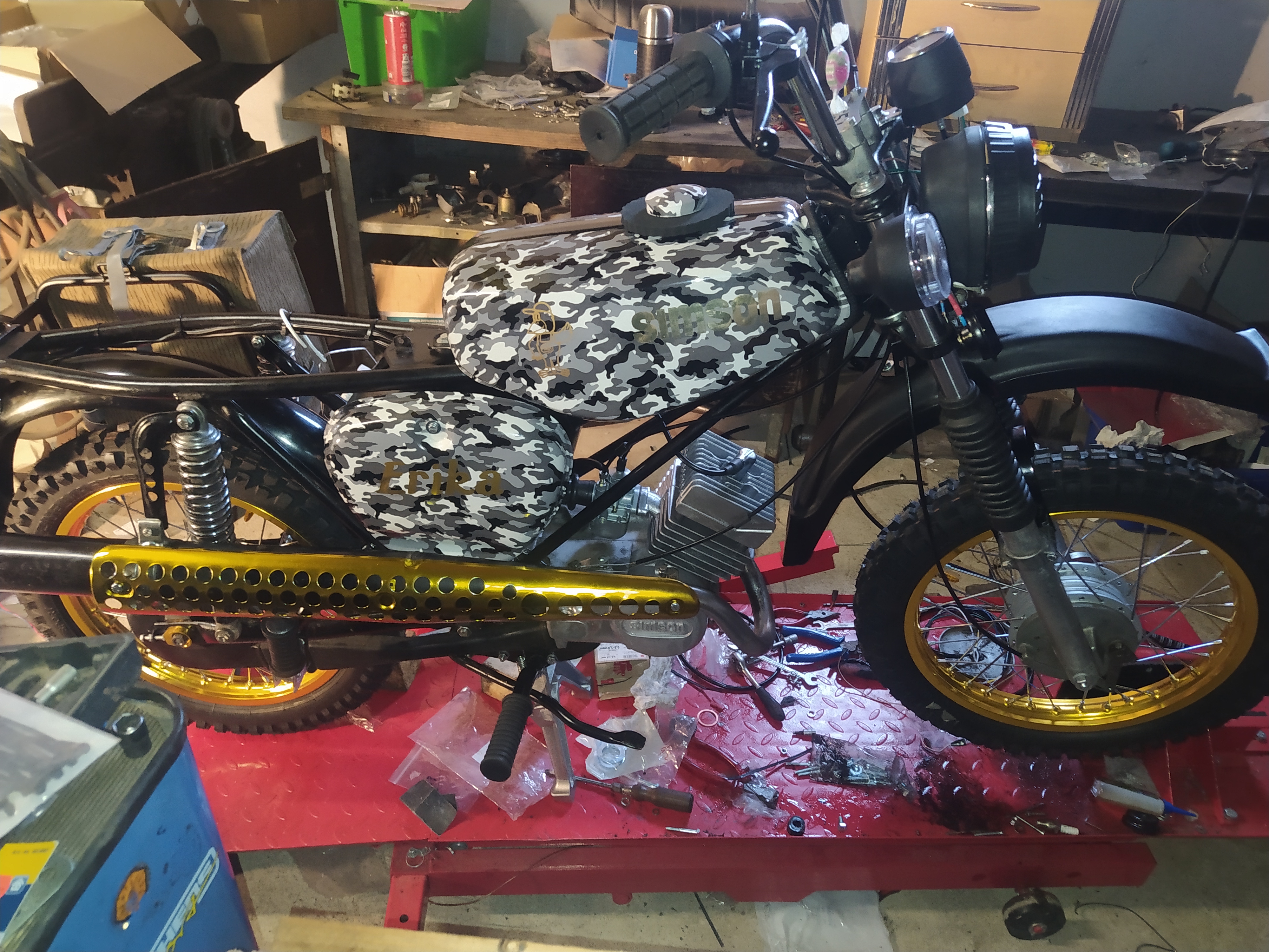 Die Optik wird grob gesagt ein durchaus wilder Mix aus Patina (Rahmenteile, kleine Dellen im Tank etc) mit goldenen Teilen werden. Das Tankset ist dabei in Us Schnee Camouflage gehalten und wurde mit Aufklebern in gold verschönert. Die Felgen sind in Gold und das Schutzblech soll schwarz werden.