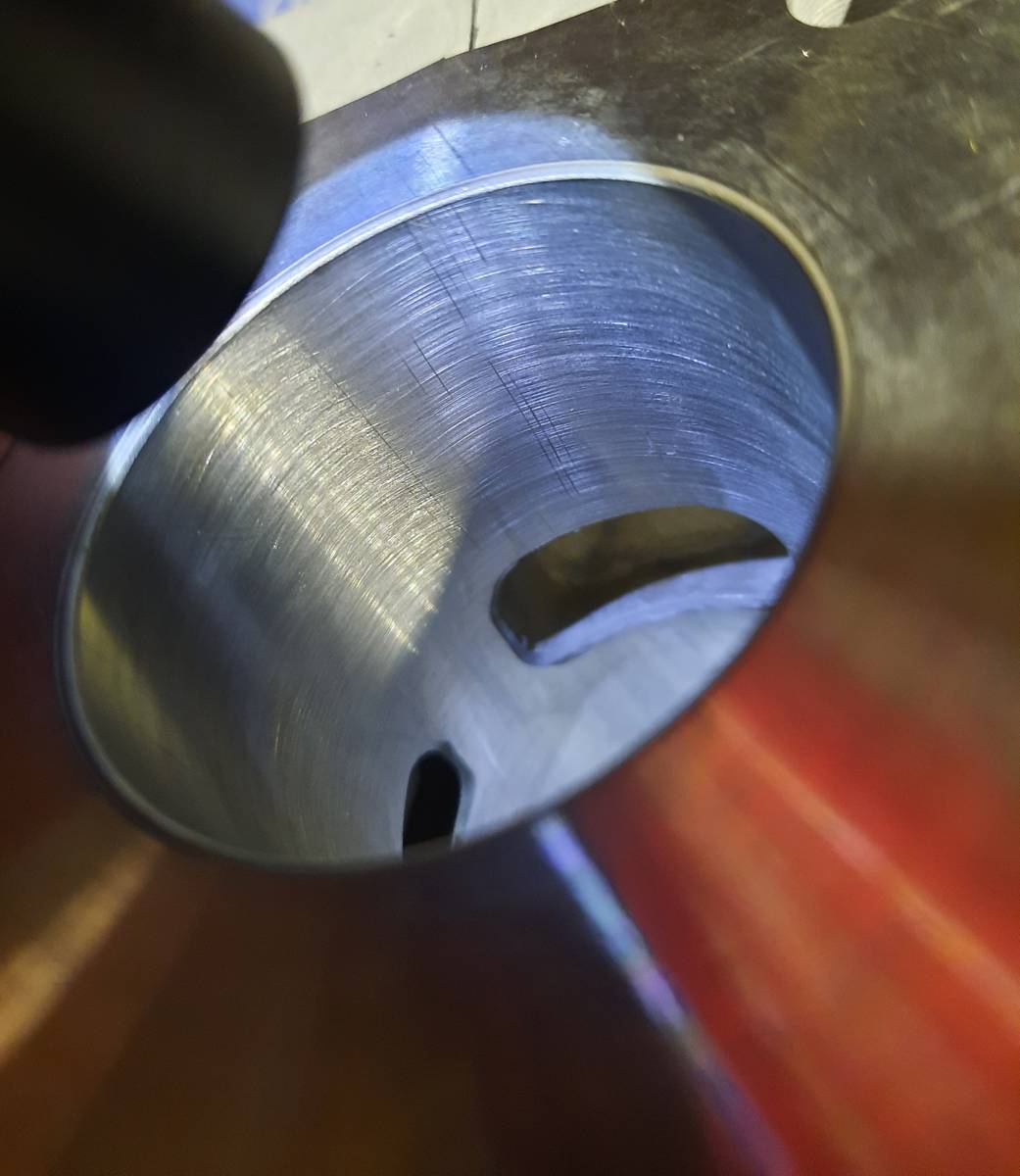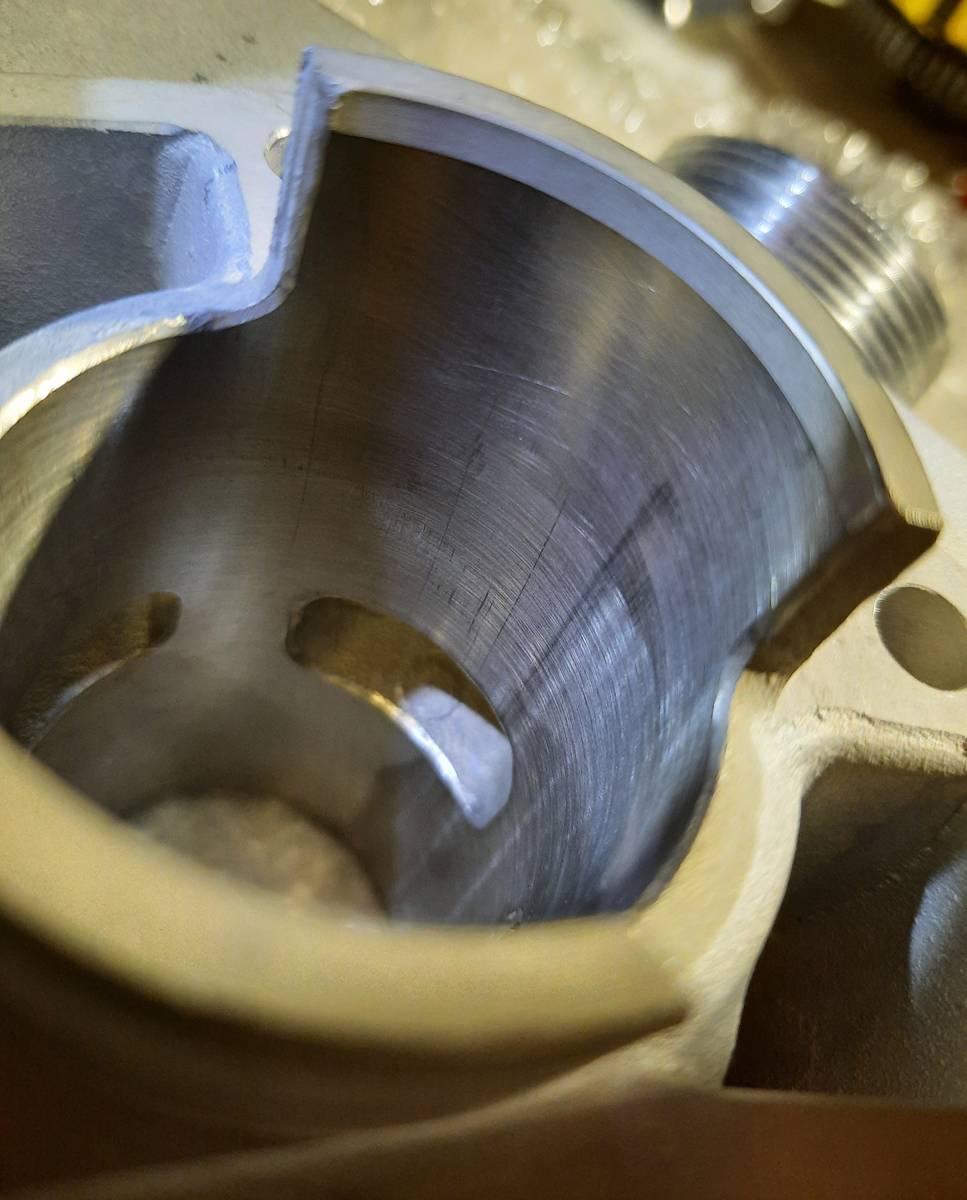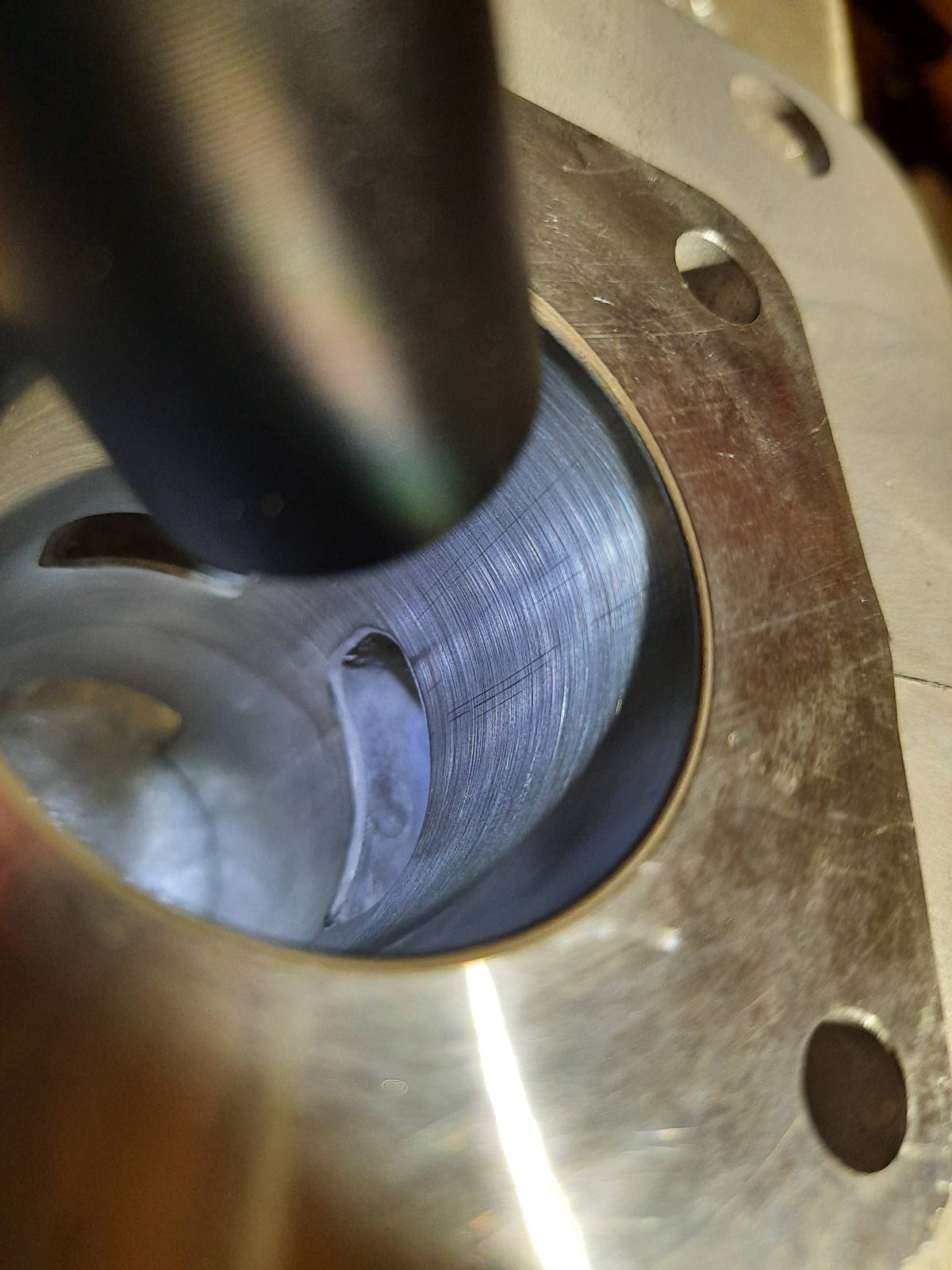 Allerdings sind auf der beschichteten Laufbuchse sichtbare "Kratzer/Riefen" zu sehen (Zylinder wurde noch nicht verbaut, noch Kolben hineingeschoben).