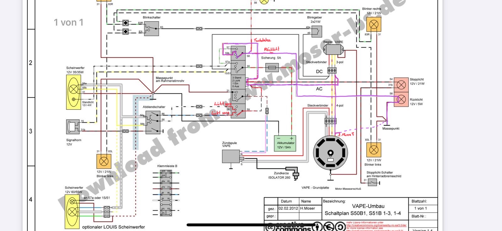 Ich habe letzte Tage eine Vape in meine S51 verbaut. Vorher war eine 12V Unterbrecher Zündung verbaut. Zündfunke ist gut und das Moped läuft sehr gut. Jedoch habe ich Probleme mit der restlichen Elektronik. Anfangs hat alles gut Funktioniert dann sind mir die Birnen vom Scheinwerfer, Rücklicht und Bremslicht durchgebrannt. Zudem habe ich nach dem Regler manchmal 12Volt und manchmal 5-6Volt. Habe jetzt nach längerem Tüfteln bemerkt, dass die die Kabel die mit Wechselspannung von der Lichtspule kommen (Gelb und Gelb/Rot) Durchgang zu Masse haben. Bin kein Elektriker aber ich denke das sollte so nicht sein. Heißt das jetzt, dass die Lichtspule defekt ist und Kontakt zur Grundplatte hat? Bin das gesamte Kabel zur Grundplatte nachgegangen und auch hinter der Grundplatte wurde nicht gequetscht