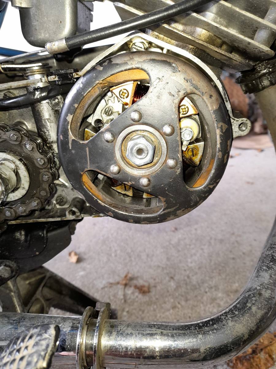 Hier sind ein paar Bilder, das Polrad kann ich leider nicht abziehen, da ich nur den Gegenhalter fürs Primärritzel habe und nicht den halben Motor zerlegen möchte(abgesehen davon, dass die Kurbelwelle dabei unnötig belastet würde).