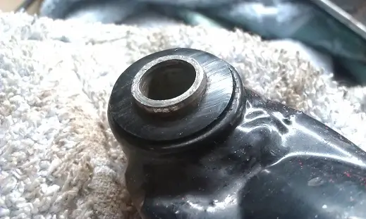 Hier noch ein paar Bilder vom einpressen. Die Schwinge ist leider sehr verrostet und eigentlich ein Fall für die Tonne. Trotzdem habe ich mir die Mühe gemacht und sie etwas entrostet und kurz mit schwarzem Lack aus der Dose lackiert, damit es nicht ganz so schlimm aussieht. Außerdem habe ich das vordere Motorlager des SR50 nochmal in Nahaufnahme Fotografiert. Das PU sitzt super und erfüllt seinen Zweck 100%ig!