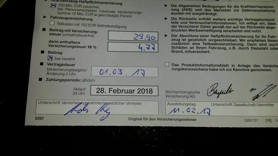 VHV-Schilder (40 Euro bei Fahrern über 23 Jahre, wie letztes Jahr auch) gibt es auch bei einem Vertreter vor Ort. Wer im Vorjahr schon eines hatte, bekommt gegen Vorkasse ein neues zugesandt.