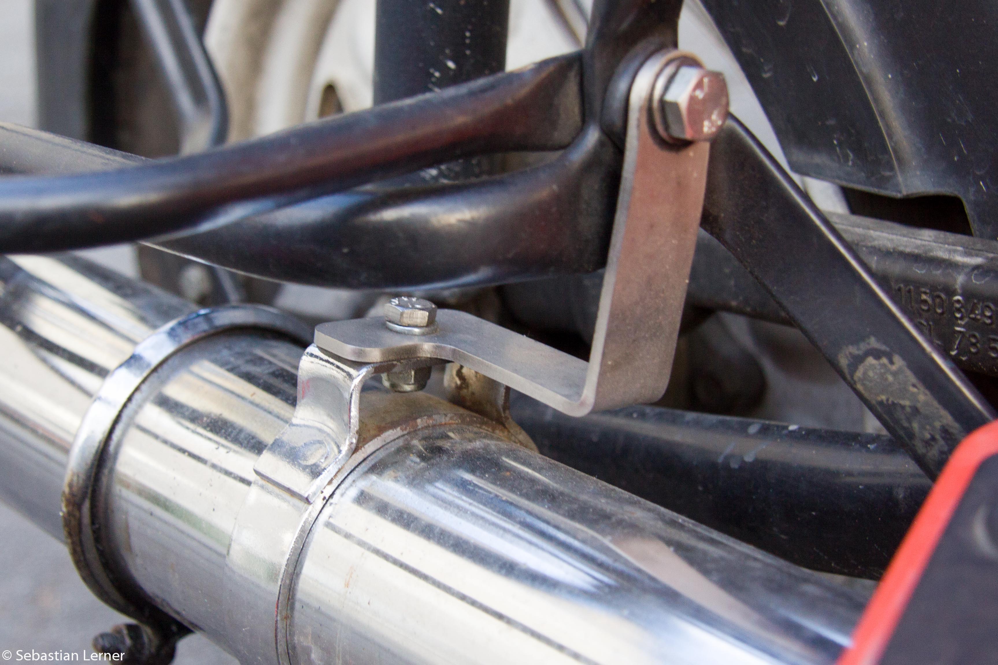 Alles was ihr braucht ist ein Seitengepäckträger auf der Auspuff Seite und die Schelle der Aufhängung unter dem Trittbrett, welche praktischerweise schon eine passende Bohrung haben sollte. Das ganze versetzt die Aufhängung deutlich weiter nach hinten und stabilisiert alles. Optimal natürlich in Kombination mit Kugelflansch. Danke an Shaggster der das Bild für mich gemacht hat.