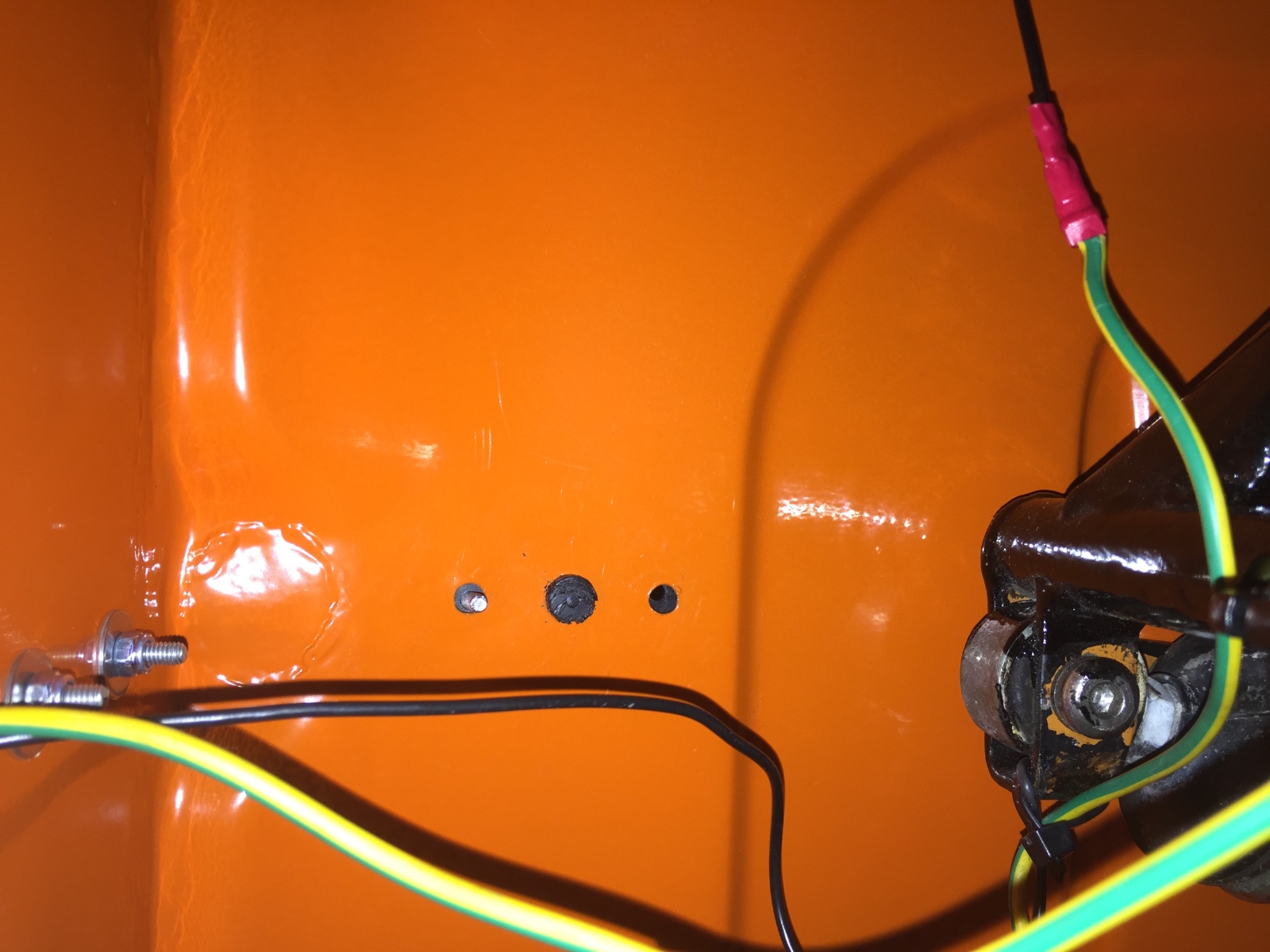 Stimmt, aber es gibt nur 3 vorgesehene Löcher an der Seite. 2 für die Schrauben, in eines kommt der Gummipömpel (Bild 2). Von hinten durch den Pömpel habe ich keinen Weg gefunden. Das Loch zum Durchführen ist neben dem Pömpel. Wie komme ich mit dem Kabel da hin, ohne ein nicht vorgesehenes Loch in das neu lackierte Seitenteil zu bohren?
