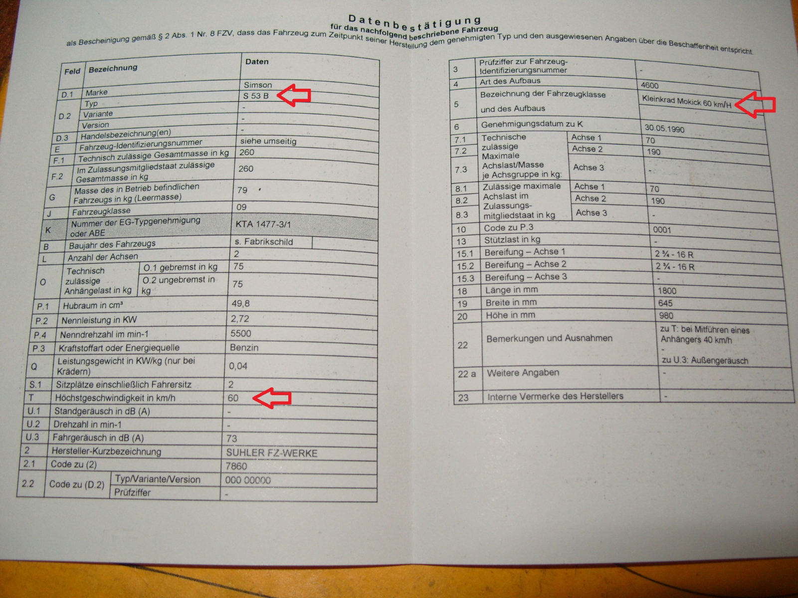 Meine "s53" bj.91 vom Suhler Fahrzeugwerk GmbH hat auch vom KBA "60kmh" Papiere bekommen...