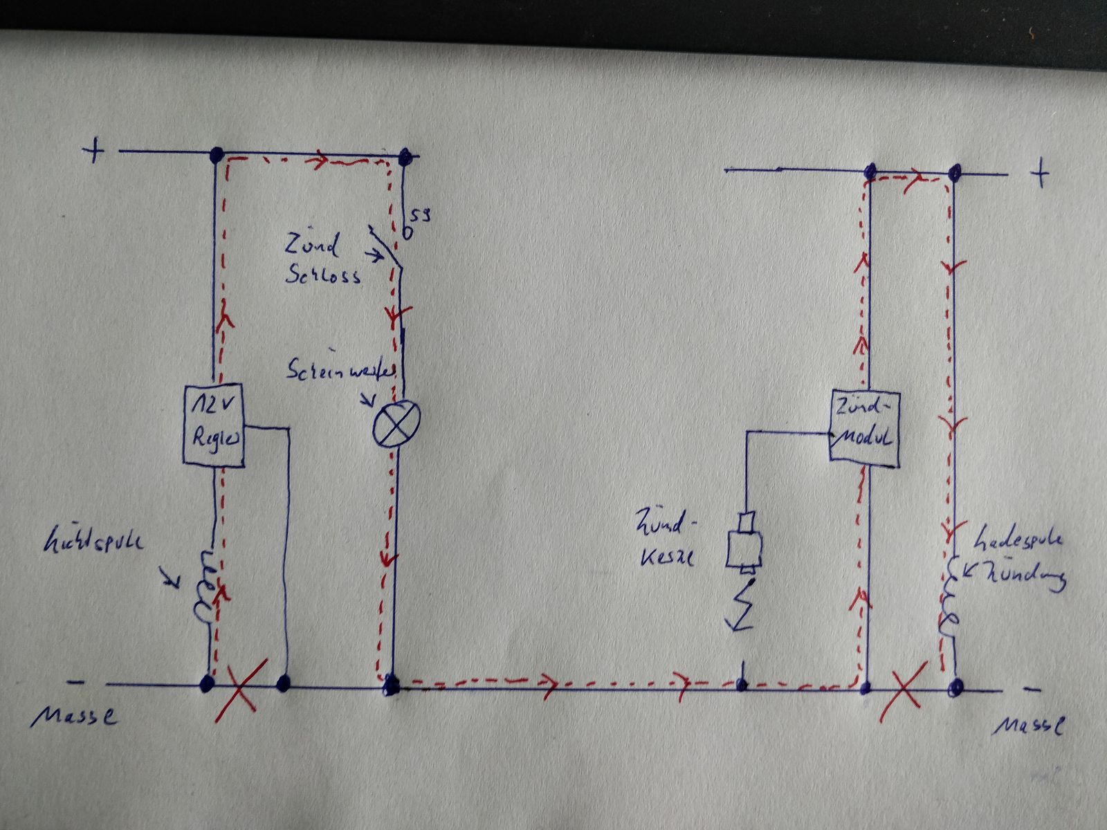 Ich denke auch es ist irgendwo ein Masse Problem. Der Tipp mit dem abklemmen aller Leitungen bis auf Zündung ist gut. Danach Schrittweise die Leitungen wieder auflegen, ggf. Kontaktflächen reinigen und Kabelschuhe zusammen biegen damit sie schön straff auf den Anschlüssen sitzen. Wichtig ist das es keine Übergangswiderstände an den Klemmen gibt. Ich hab Dir hier mal im Anhang ein Ersatzschaltbild aufgezeichnet, denn falls es Übergangswiderstände oder Masse Probleme gibt, hast Du im Schlimmsten Fall zwei Gegenläufige Spannungsquellen der Lichtspulen und der Spule für die Zündung. Das kann schon bei kleineren Widerständen Zündleistungs Verlust bedeuten.