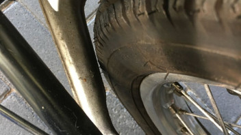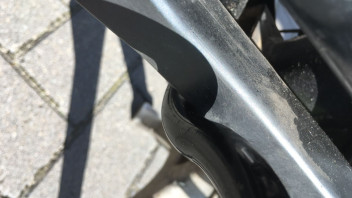 Und ein neues Problem. Der Kippständer berührt das Hinterrad. Wenn die Federbeine auf Soziusbetrieb gestellt sind, ist es sehr knapp auf der linken Seite (Fahrtrichtung). Auf Solobetrieb reibt die linke Seite Die rechte Seite hat relativ viel Platz. Auf dem letzten Bild zu erkennen.