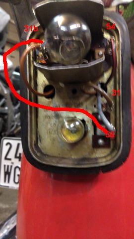 Alle Kabel sind da wo sie hingehören, Das Bremslicht leuchtet wann es soll, nur das Rücklicht bleibt aus. Durch einen Zufall stellte ich fest, daß wenn ich Klemme 31b( Kabel vom Stopplichtschalter) mit der Klemme58 (Kabel vom Zündschloss zum Rücklichtanschluss) verbinde, das Rücklicht brennt und aus geht, wenn dann die Bremse betätigt wird und das Bremslicht angeht. Das funktioniert allerdings auch, wenn die Beleuchtung nicht eingeschaltet ist. Und das ist, was ich nicht verstehe.Denn an Klemme 31b sollte ja nur bei betätigter Bremse Strom fliessen. Hat vielleicht jemand eine Idee wo ich da eine Knoten im Kopf habe? Zur Verdeutlichung hab ich mal eingezeichnet von wo nach wo die Überbrückung stattfindet. -