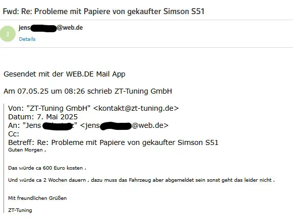 Der Kauf war 2019, leider steht im Kauf davon nichts. Zudem steht im Kaufvertrag kein Moped sonder Verkauf eines Gebrauchten Motorrads. Leider kannte sich mein Vater nicht damit aus. Das DEKRA-Gutachten von ZT war nicht gestempelt. Jetzt werden durch ZT neue DEKRA Papiere mit Stempel erstellt. Dafür haben wir auch einen Beleg, jedoch wie die das Abstempeln wollen Wissen wir nicht. Aber ich werde mit meinen Vater nochmal mit Jens Opitz darüber reden. Dieser steht auch auf unserm Kaufvertrag als Verkäufer drauf. Rechtlich sieht es schlecht aus und würde sinnlos viel Geld kosten.