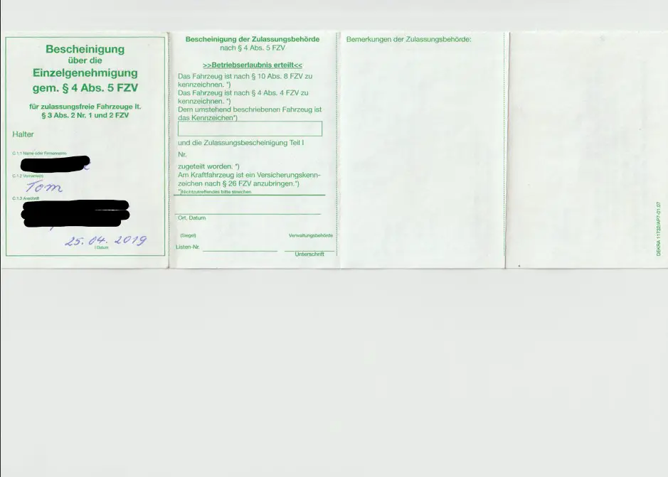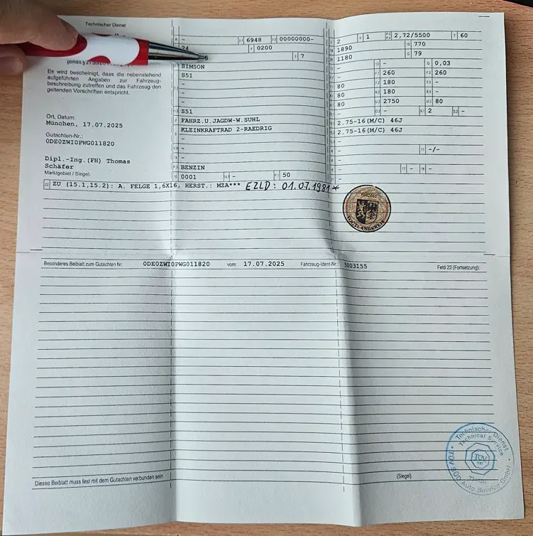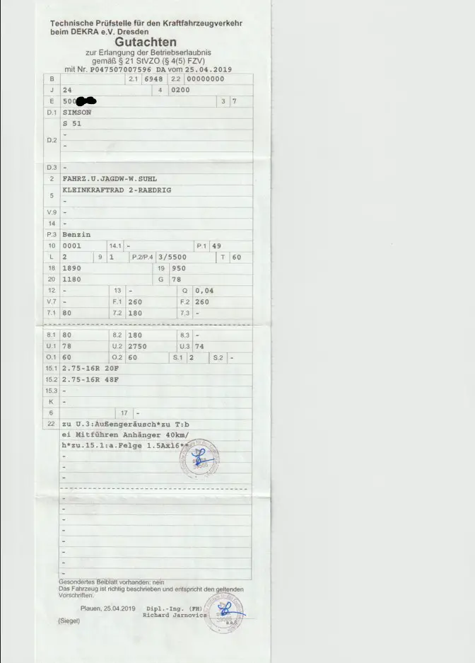 Mein Vater hat mir 2019 zur Jugendweihe eine Simson S51 in Billardgrün von ZT geschenkt. Dieses hatte DEKRA-Papiere welche durch ZT erstellt wurden.