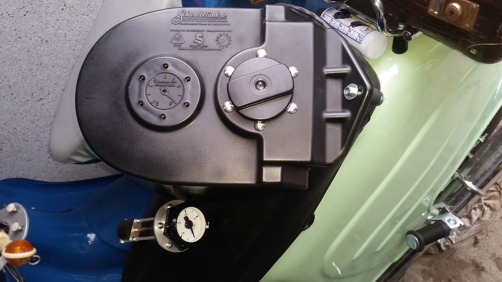 Meine Beweggünde für den Kauf: Meine Fahrzeuge werden leider nicht allzu häufig bewegt (bis auf mein Alltagsmoped) und die Schwalbe habe ich für meine Frau aufgebaut. Diese ist noch recht simsonunerfahren, da ist eine Tankanzeige für das weibliche Geschlecht schon eine greifbare Information und keine Schätzung nach Blick in den Tank von Simsonerfahrenen (bevor man einen Anruf bekommt: "Schatz, kannst du mich und die Schwalbe mal abholen...bin liegengeblieben?"). Meistens werden damit kleinere Sonntagsausflüge gemacht. In letzter Zeit habe ich beim Blechtank und dem originalen Simson-Tankdeckel Probleme mit der Tankentlüftung, weil der Tankdeckel und die Entlüftungsbohrung immer wieder etwas anrostet, wenn der Tank nicht gänzlich gefüllt ist. Natürlich könnte man auch einen neuen bzw. besseren Tankdeckel besorgen, aber dann fehlt ja nun der Reiz.