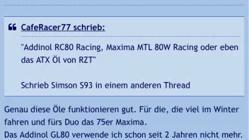 • Also ich hab addinol in meinen Kisten mit 4-gang und Stino Kupplung, und da gibt's keinerlei Probleme! Getriebe schalten Butterweich, Kupplungen funktionieren super!