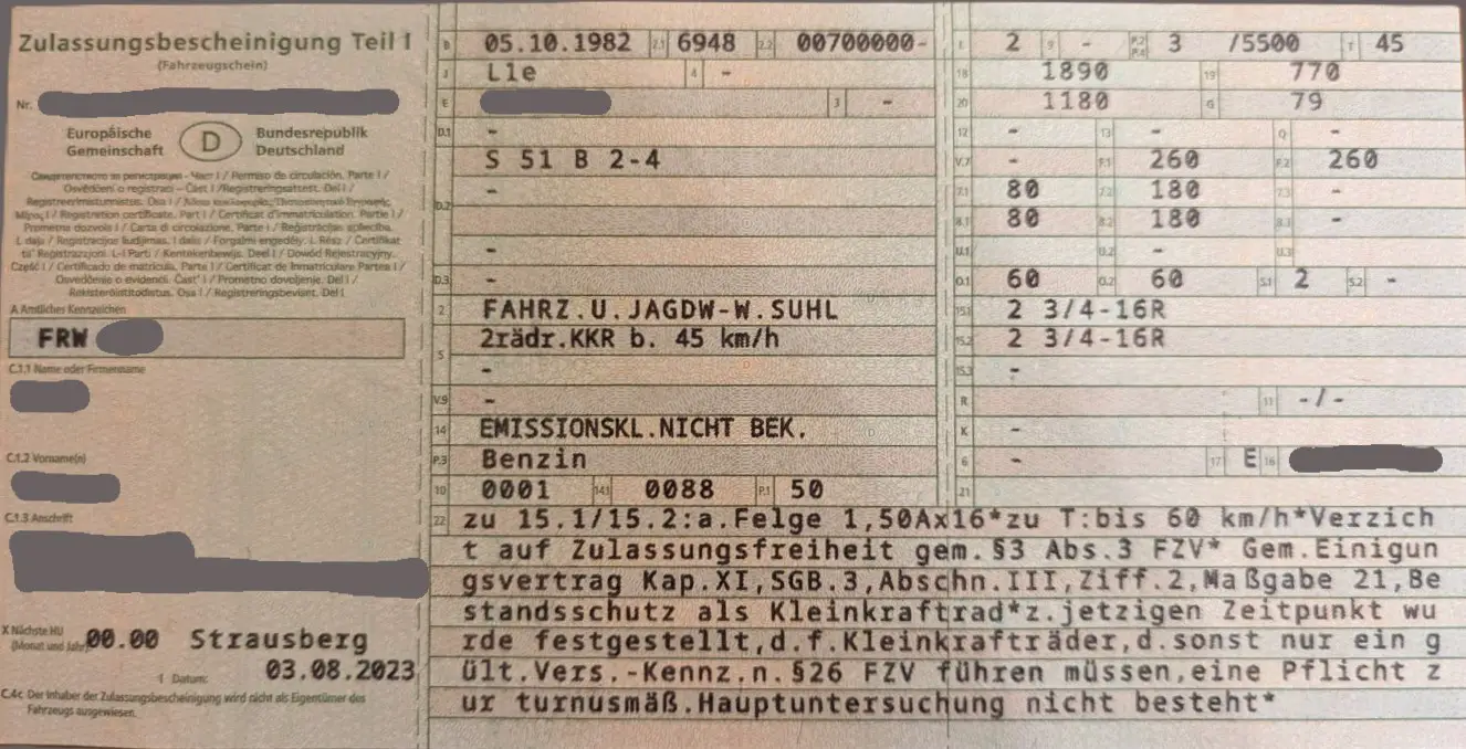 Da ich Berlin den Rücken gekehrt habe, war auch das Ummelden der Fahrzeuge notwendig. Das war bei der Simson mit freiwilliger Zulassung, dank der sehr motivierten netten Mitarbeiterin, relativ Problemlos erledigt. Ich hätte in dem Zuge die freiwillige Zulassung auch ablegen und auf ein Versicherungskennzeichen wechseln können, wollte ich aber nicht.