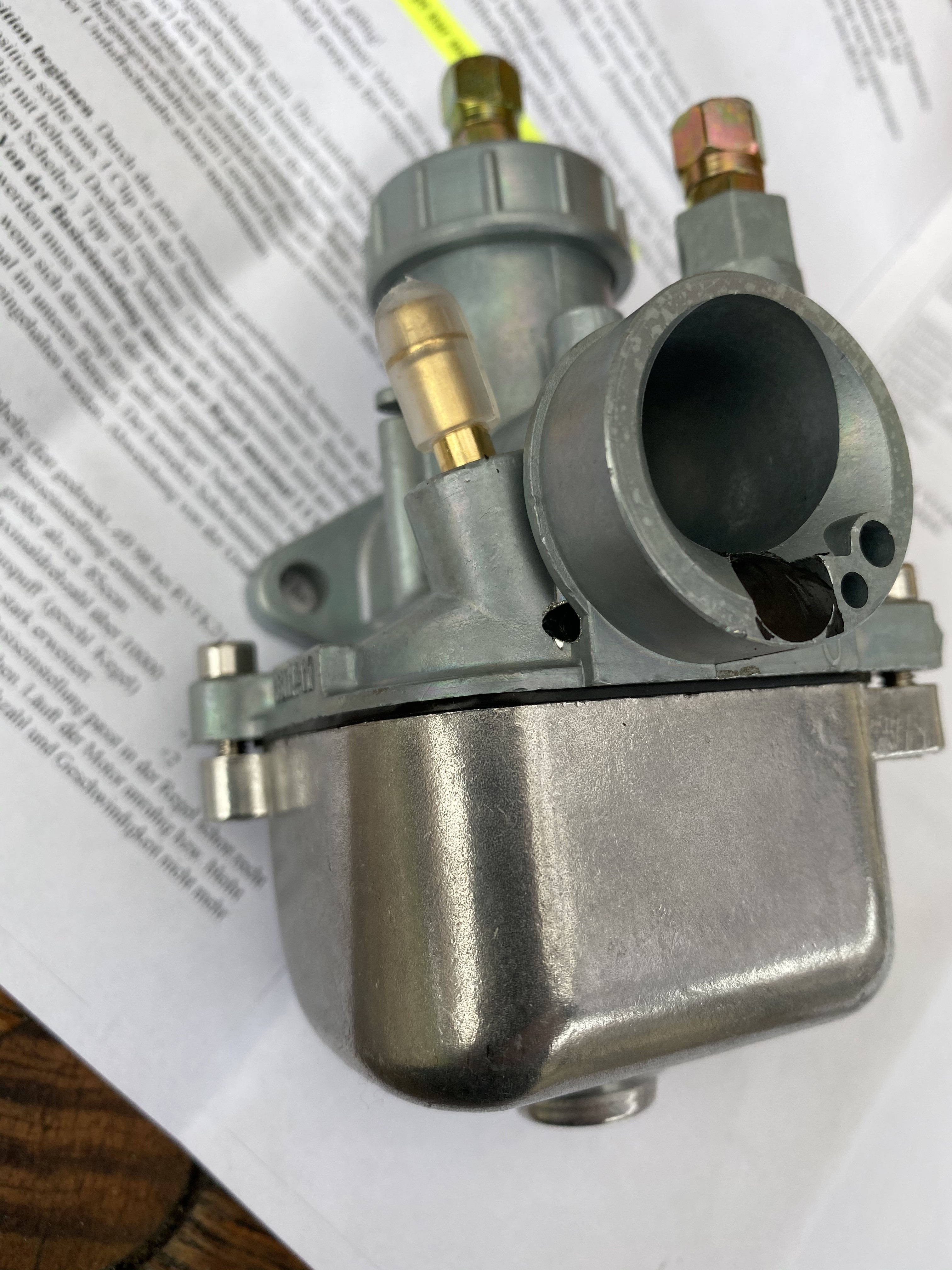 Ich bin jetzt aber doch ein bisschen verwundert als ich meiner Vergaser sah, da es ja einfach nur ein CS Vergaser ist bei dem das Loch hinten mit Silikon verschlossen wurde und in die Seite ein Loch gebohrt wurde.