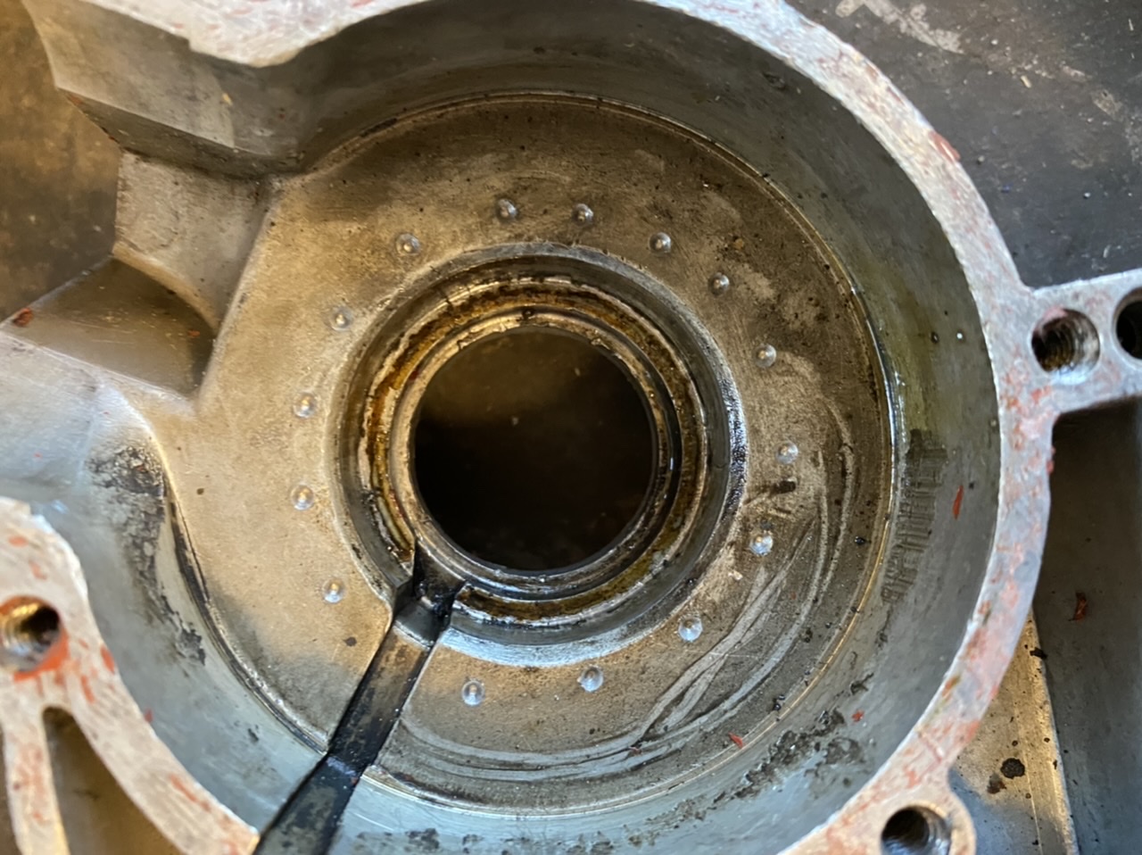 Keine Passstifte zwischen den Hälften, den Block konnte ich mit den Händen locker auseinander ziehen. Kurbelwelle kann man mit samt Lager einfach quer durchs Zimmer zielgenau einwerfen...