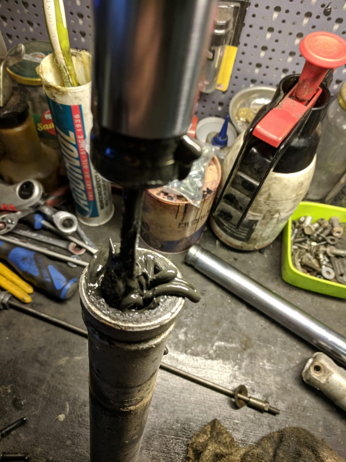 Jemand hatte wohl mal die glorreiche Idee, statt Öl, die Telegabel mit Fett zu füllen. Ich meine, dass dämpft ja viel besser.