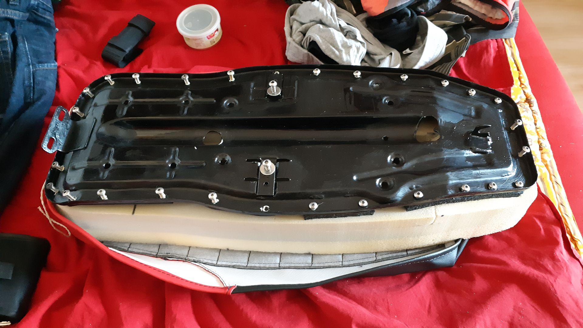 der sitzbankkern stammt aus einer bootspolsterei, lag schon seit 2019 bereit ? sitzbankblech wurde vorher entrostet, mit fertan behandelt und dann mit brantho übergepinselt. mit reichlich brantho ? (hat auch nur 2 monate getrocknet ?)