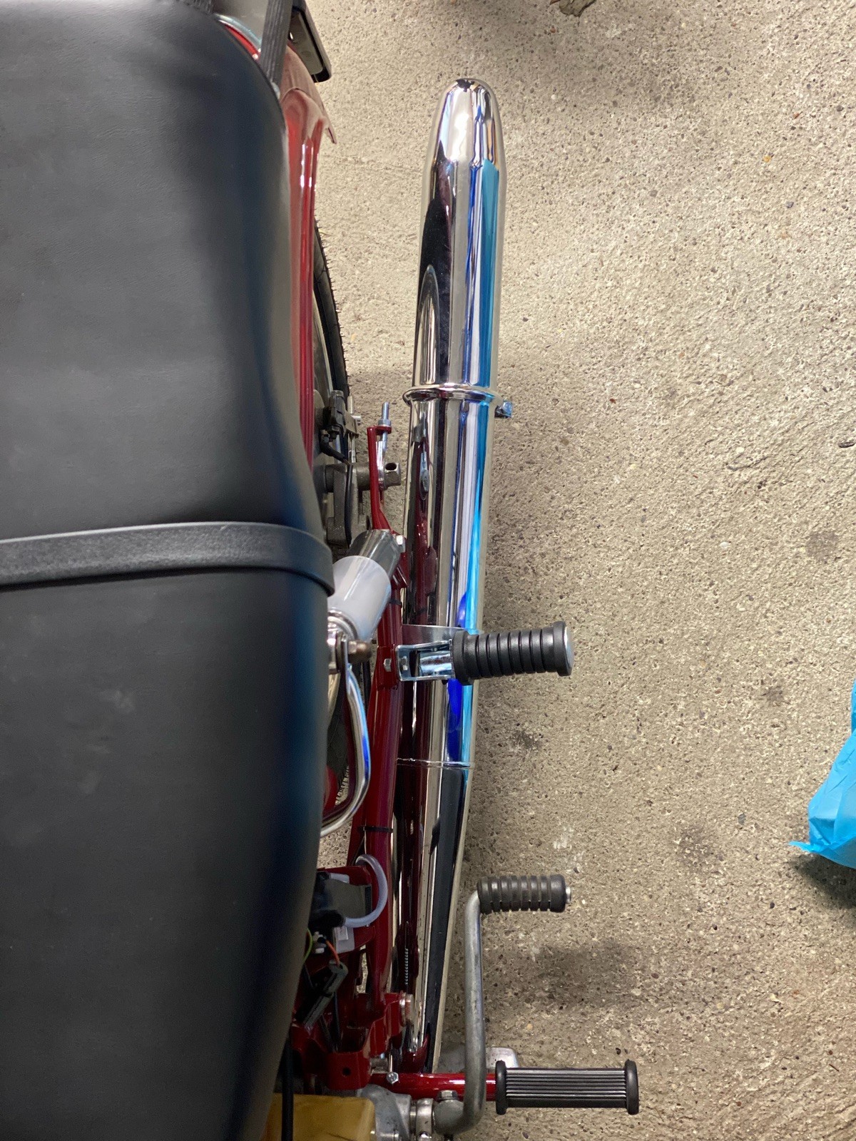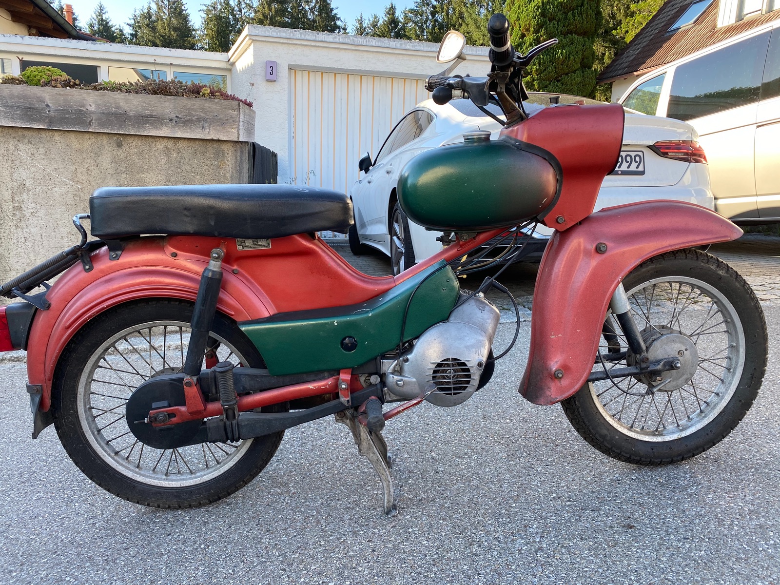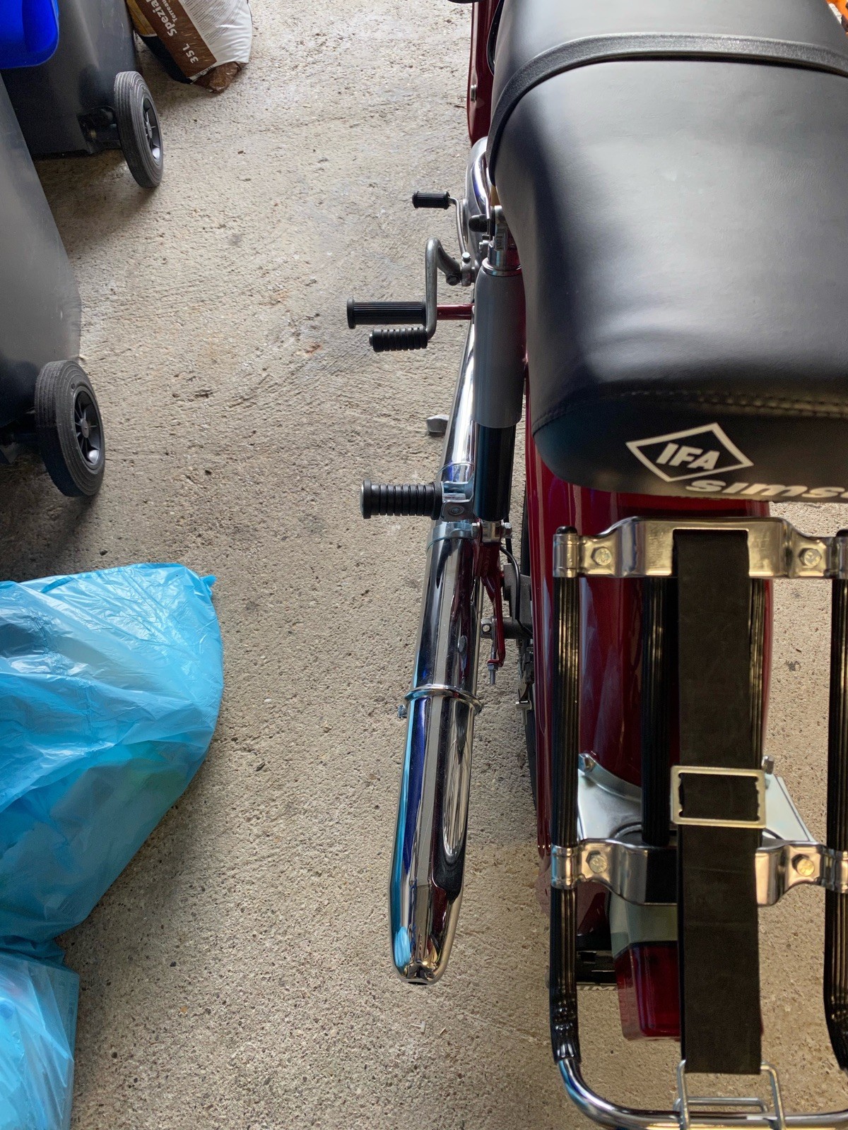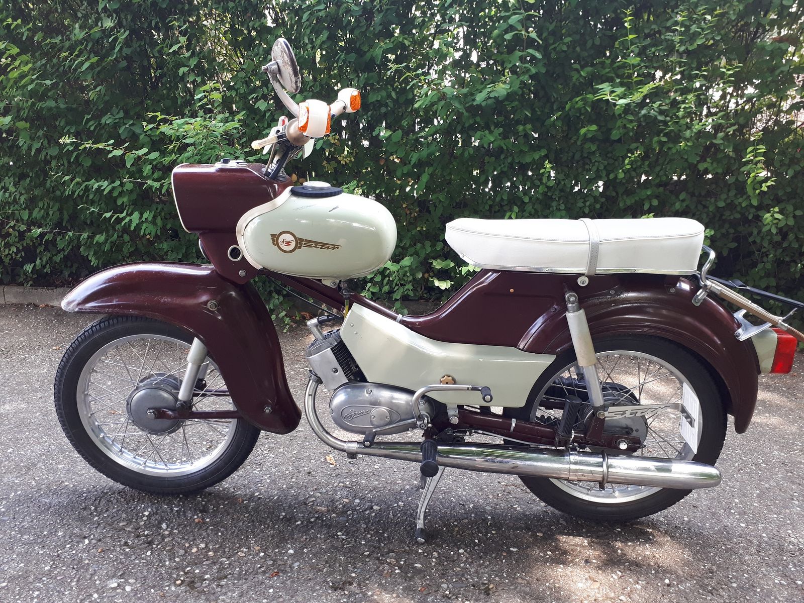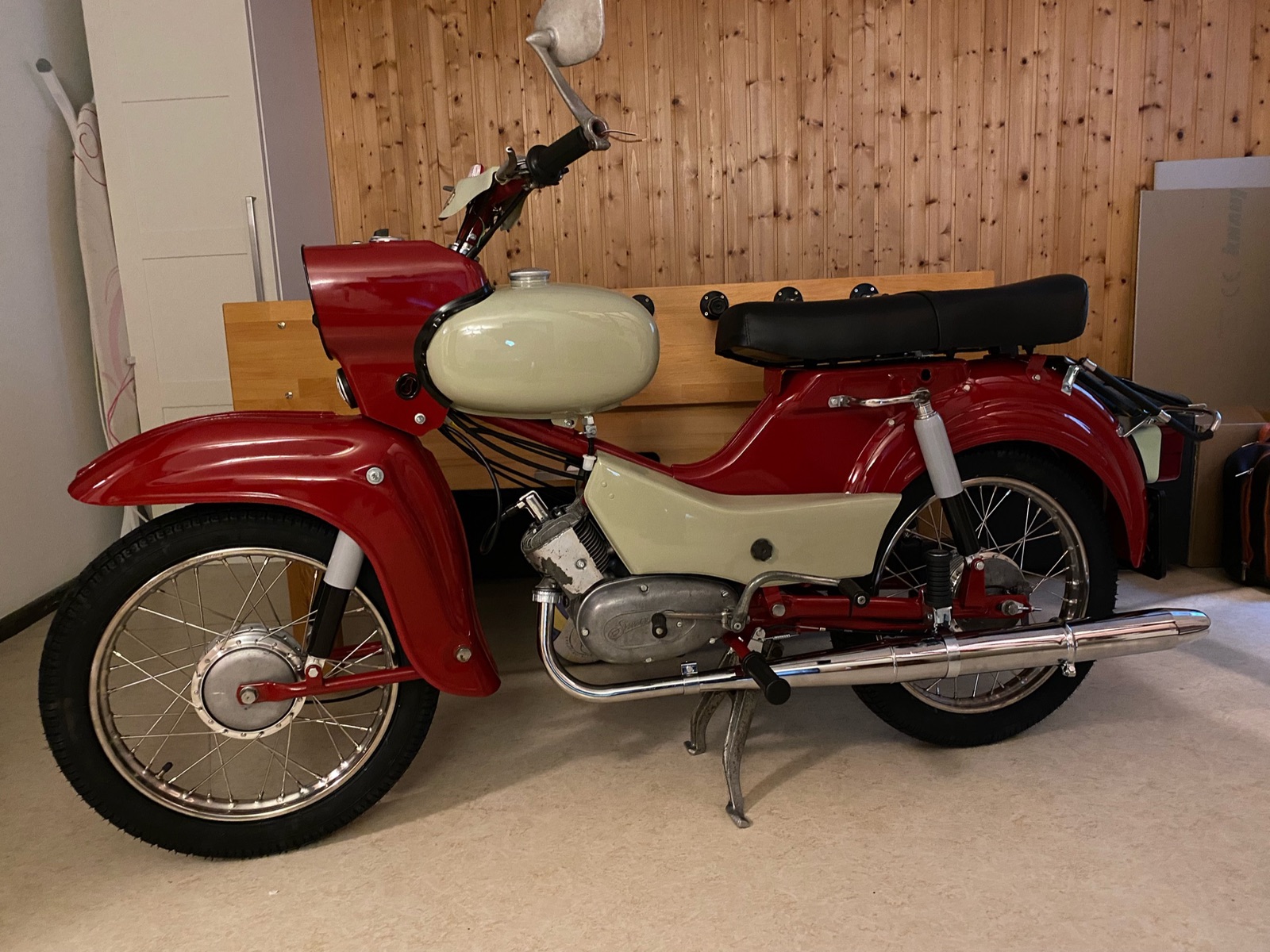 Wir haben den Vogel hübsch tranchiert, den Motor regenerieren lassen, eine Vape eingebaut. Der Rahmen ist gestrahlt und lackiert und mit allerlei neuen Teilen wieder alles zusammengebastelt.