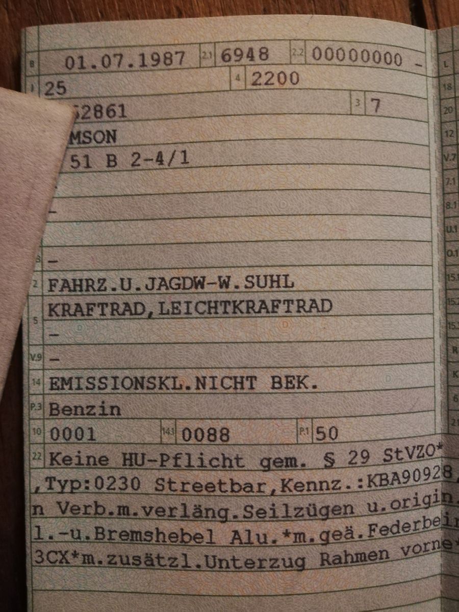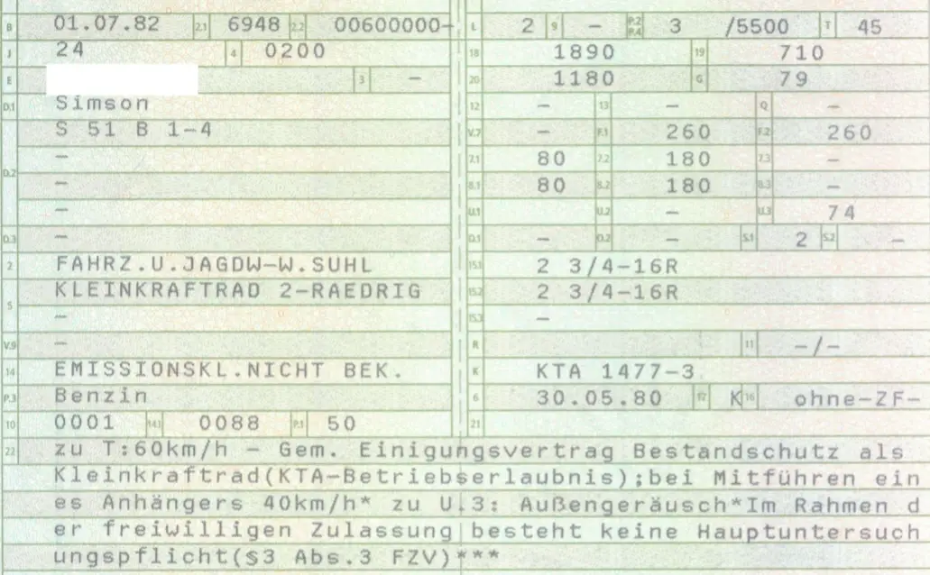 Beim eintragen/umtragen der fahrzeugpapiere wurde meine Simson kurzerhand zum leichtkraftrad da die Nummer garnicht mehr im System zur Auswahl stand.