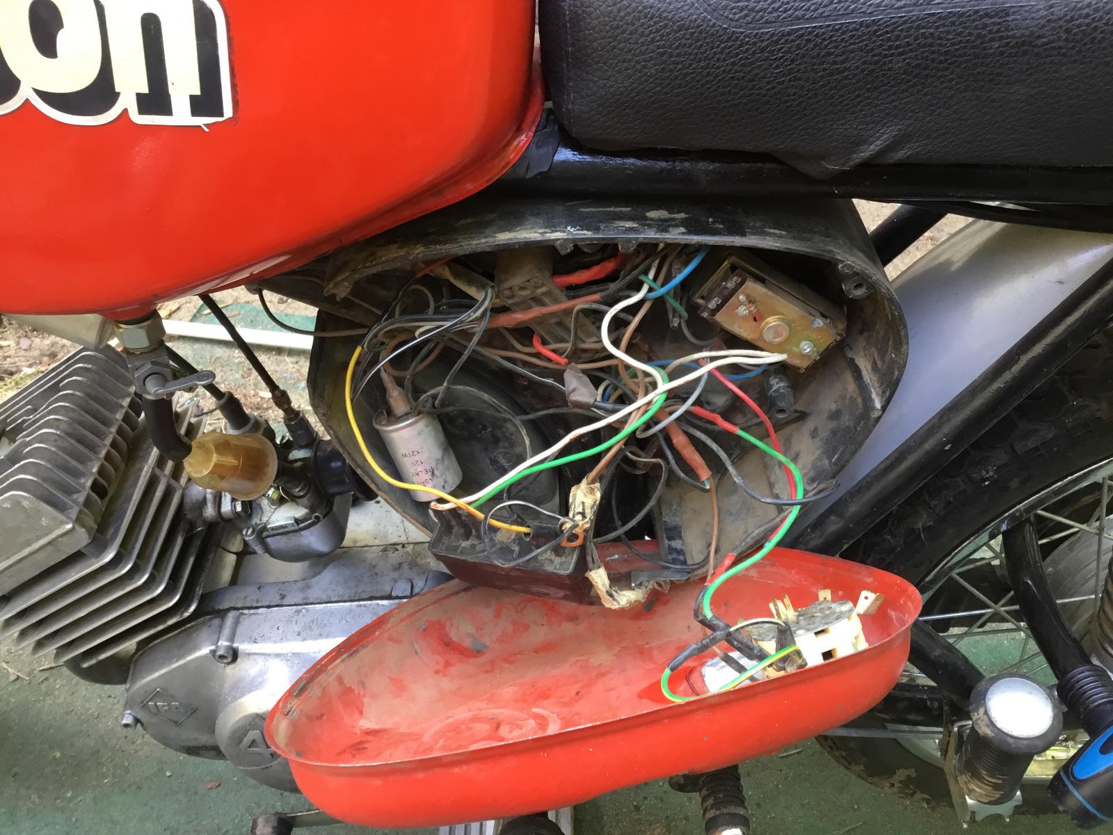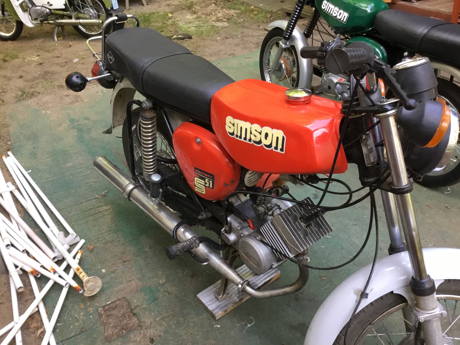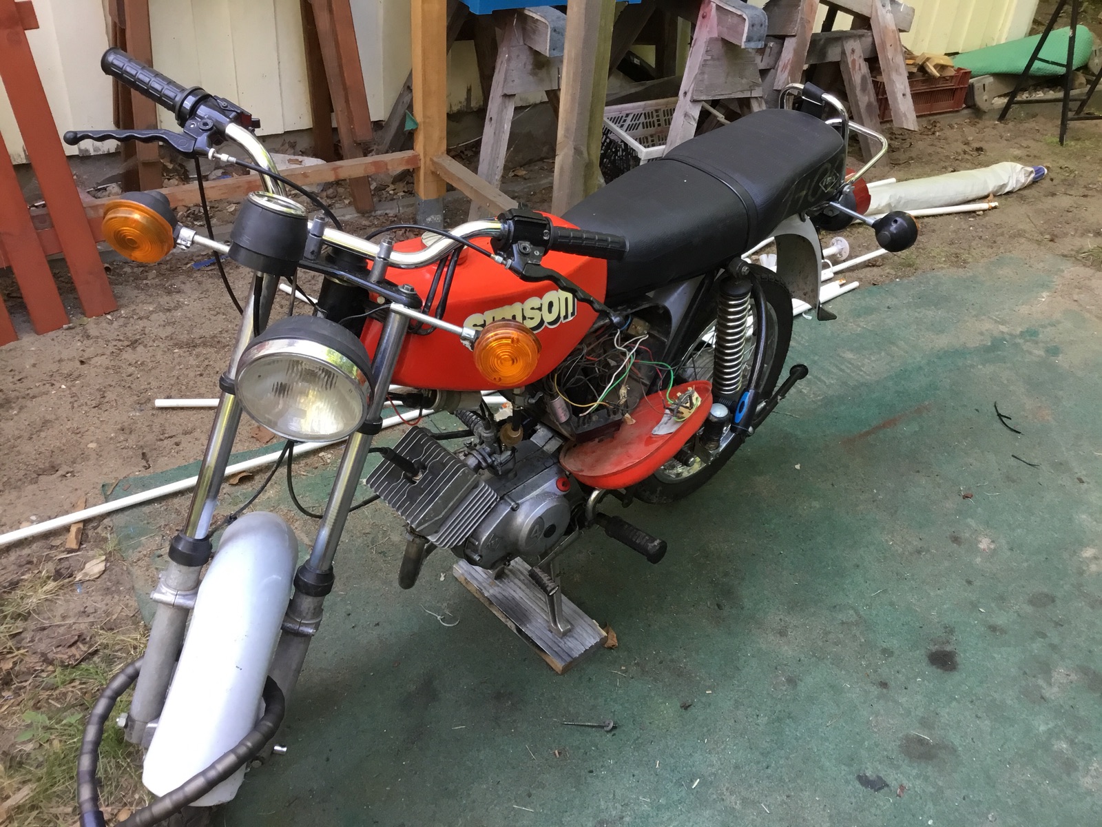 Hallo Leute. Heute hab ich zwar nix gemacht, bin arbeiten, aber in den letzten Tagen. Neulich kam eine gute Bekannte zu mir und sagt, dass sie von ihrem Sohn noch eine Simson hätte. Ich solle diese mir mal ansehen. Nun, zunächst hatte ich eigentlich keinen Bock, aber dann… . Nun, hat es mir schon interessiert, was sie da für ne Simson nun hat. Ich also hin und siehe da, ein rotes kleines S Einundfünfzigchen, 12Voltäre, mit E-Zündung, Baujahr 85. Auf den ersten und zweiten Blick sieht diese garnicht soo schlecht aus. Egal, zur Pol und checken lassen. Aller IO. Rahmennummer auch fit. Kannste also nix verkehrt machen. Zu Hause angeschoben gekommen und die Neugier siegte. Deckel runner. Ich sag’s mal so, ehm Kabelsalat nannte man dies wohl früher, wenn die mehr oder weniger so Kreuz und quer herum baumeln, wie im Bild zu sehen. Denke aber, dass dies schon ein guter Kauf war. Hab ja Zeit das Prachstück wieder auf die Straße zu bringen.