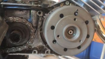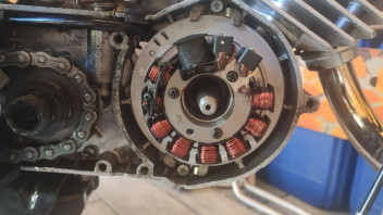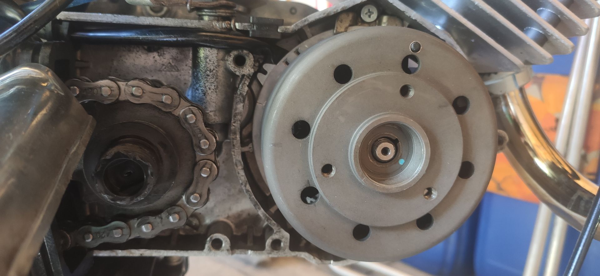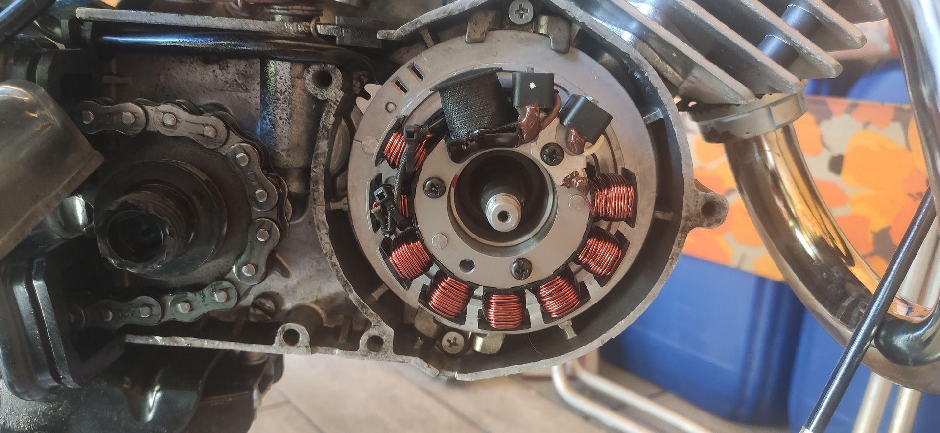 Habe 2 Bilder angefügt. Die Markierung auf dem Polrad habe ich angebracht, das ist der Punkt wo der Nichtmagnet sitzt der den Zündzeitpunkt auslöst. Kolbenstellung 1,5mm vor OT.