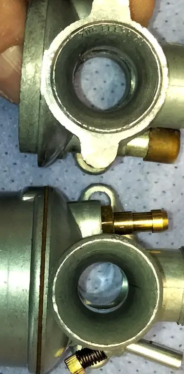 Nun stand ja noch der Vergaser auf der Liste der Verdächtigen. Also ran und ab das Teil. Auf der Werkbank in Teile zerlegt sah die Sache so aus. Bild 1. Sicher fällt dem Geschultem Auge sofort auf was ich durch nen dummen Zufall, dann auch sah. Richtig. Siehe Bild 2.