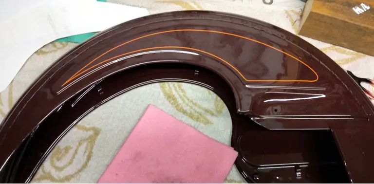 Nun war der Federungskasten und der hintere Kotflügel fertig. Folgen sollte nun der vordere Kotflügel, den ich mir ein paar Tage später vorgenommen hatte. Wie immer habe ich natürlich auch ein Bierchen stehen, doch diesesmal ließ ich die Pulle im Kasten. Aus gutem Grund. Anders wie bei den vorherigen Teilen musste ich nun eine 1 Millimeter breite, von einem 5 cm breiten und vorgeschnittenden Streifen abfummeln und auftragen. Hierzu hatte ich mir eigens ein paar schöne Fotos aus dem Netz geladen, auf denen ich die ungefähre Lage des Streifens ableiten konnte. Am schlimmsten und schwierigsten ist immer das Ansetzen. Also wirklich, die Streifen sind nur 1 mm breit und somit besteht auch die Gefahr, dass man die Dinger etwas zu stark zieht und somit ein reißen riskiert. Schön ruhig und sachte, Stück für Stück. Nach gut 2 Minuten, dann die erste Linie gezogen. Nein, nicht was Ihr wieder denkt. :yapyap: