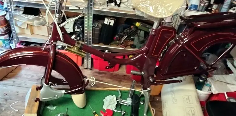 Nach ein paar Tagen Pause habe ich dann weitergemacht. Zuerst habe ich die Schalen für die Lenkerlager eingebaut, dann kam die Gabel drann. Dort musste der gabellaufring aufgebracht werden. Auch hier war wieder die Pulverbeschichtung die ein einfaches Aufpressen unmöglich machte. Schließlich kam die Feile wieder dran und zack, war der Lack ab, wie man so schön sagt. Mit etwas Spucke und guten Willens saß dieser nun auch bald dort, wo er hingehört.