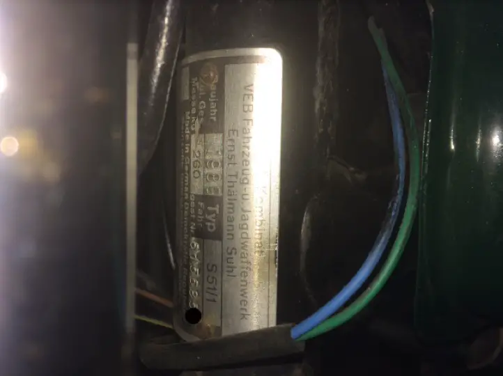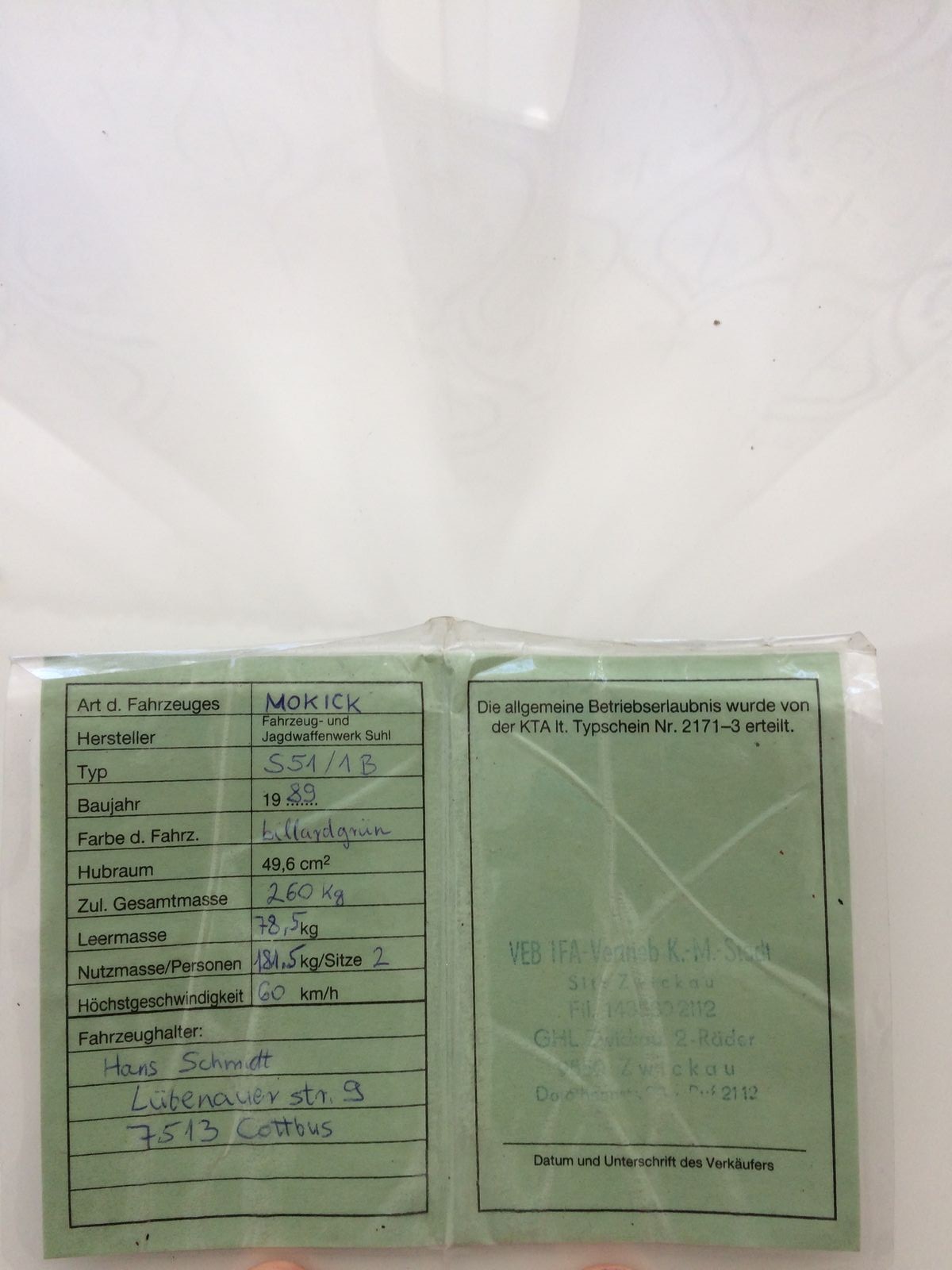 die Betriebserlaubnis sowie das fehlende Tacho haben meine Aufmerksamkeit geweckt. Zudem war komischerweise eine Ungarische 12V Batterie verbaut obwohl die S51 noch die Original Zündung hat. Blinker wurden denke ich nachgerüstet da der Kabelbaum ziemlich zerranzt ist. Soziusfußrasten sind jedoch dran. Verbaut ist ein 4-Gang Getriebe. Kicker habe ich verbaut sowie die Orangenen Schrauben, und den 16N1 Vergaser. Verbaut war davor ein 16N12. Interessanterweise gab es einen Vorfall in meiner Gegend, unzwar wurden einige Roller geklaut. Dannach ist die Polizei hier ihre Runden gelaufen und hat Stichprobenweise einige Nachbarn inkls. mir dazu aufgefordert die Betriebserlaubnis deren Roller vorzulegen. Haben die gefälschte Betriebserlaubnis von der Simme mitgenommen und habe sie nach 2 Wochen wieder bekommen, es seihe alles in Ordnung.
