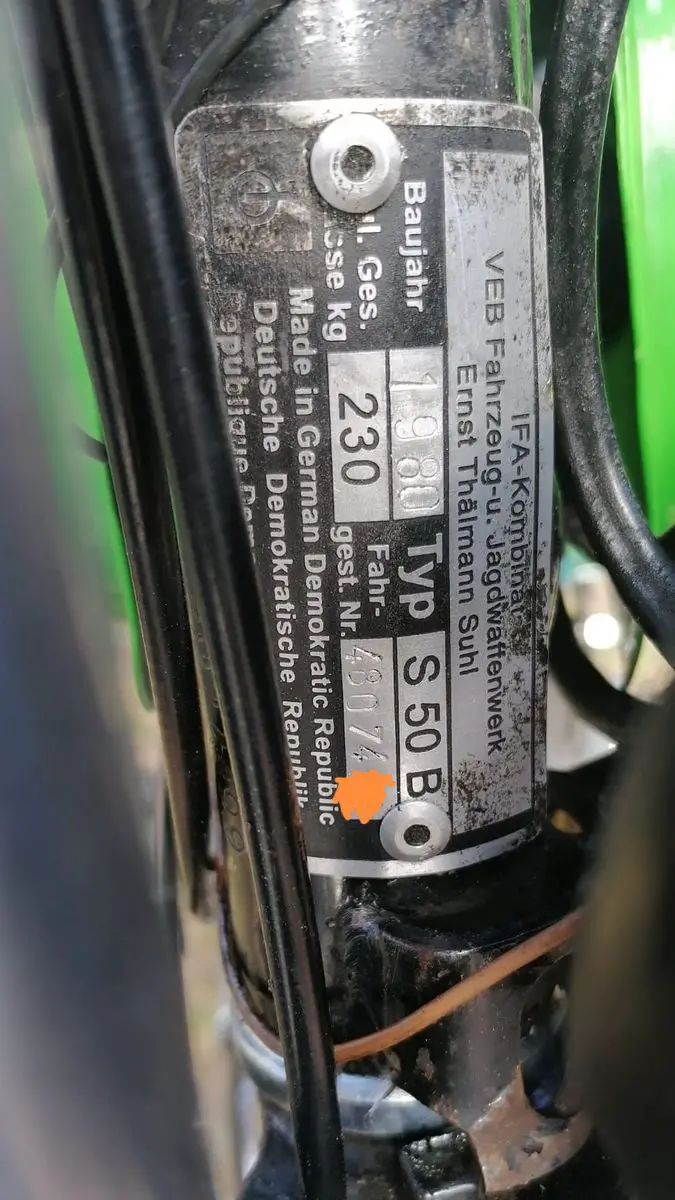 Hier mal das Schild, die ist wie gesagt von 1980. Rahmennummer stimmt. Im Netz finde ich s50 bis 1980 gebaut, da ist auch meine Nummer mit dabei. Freunde haben das Schild untersucht, die meinten es ist auch defitniv echt "alt" , von damals, kein neues nach gemachtes. Bremshebel ist von der S50