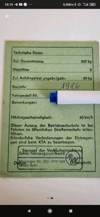 Ich bin heute auf für mich fragwürdige Sr50 Papiere gestoßen. Leider habe ich nur Fotos bekommen. Der Sr50 hat laut Schein ein Baujahr von 1986. Der Stempel unten ist aber von der Suhler Fahrzeugwerke GmbH, welche laut Wikipedia Ende 1991 / Anfang 1992 gegründet wurde. Wie passt das zusammen?