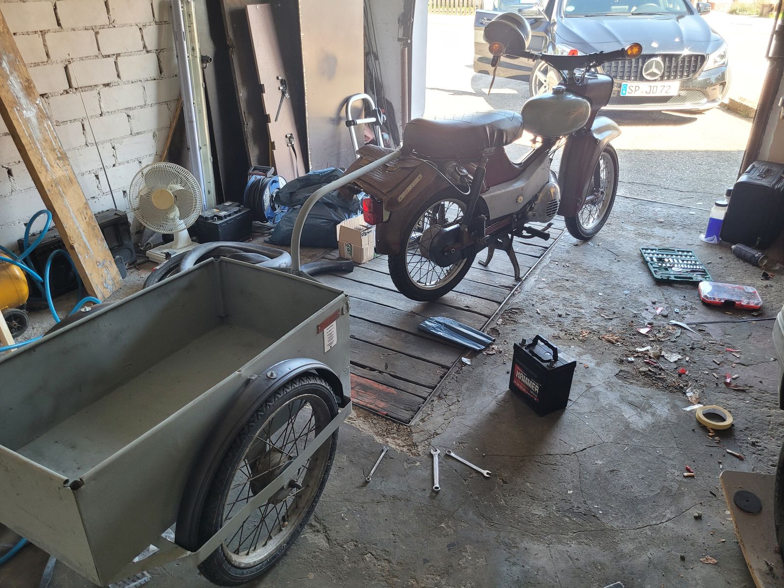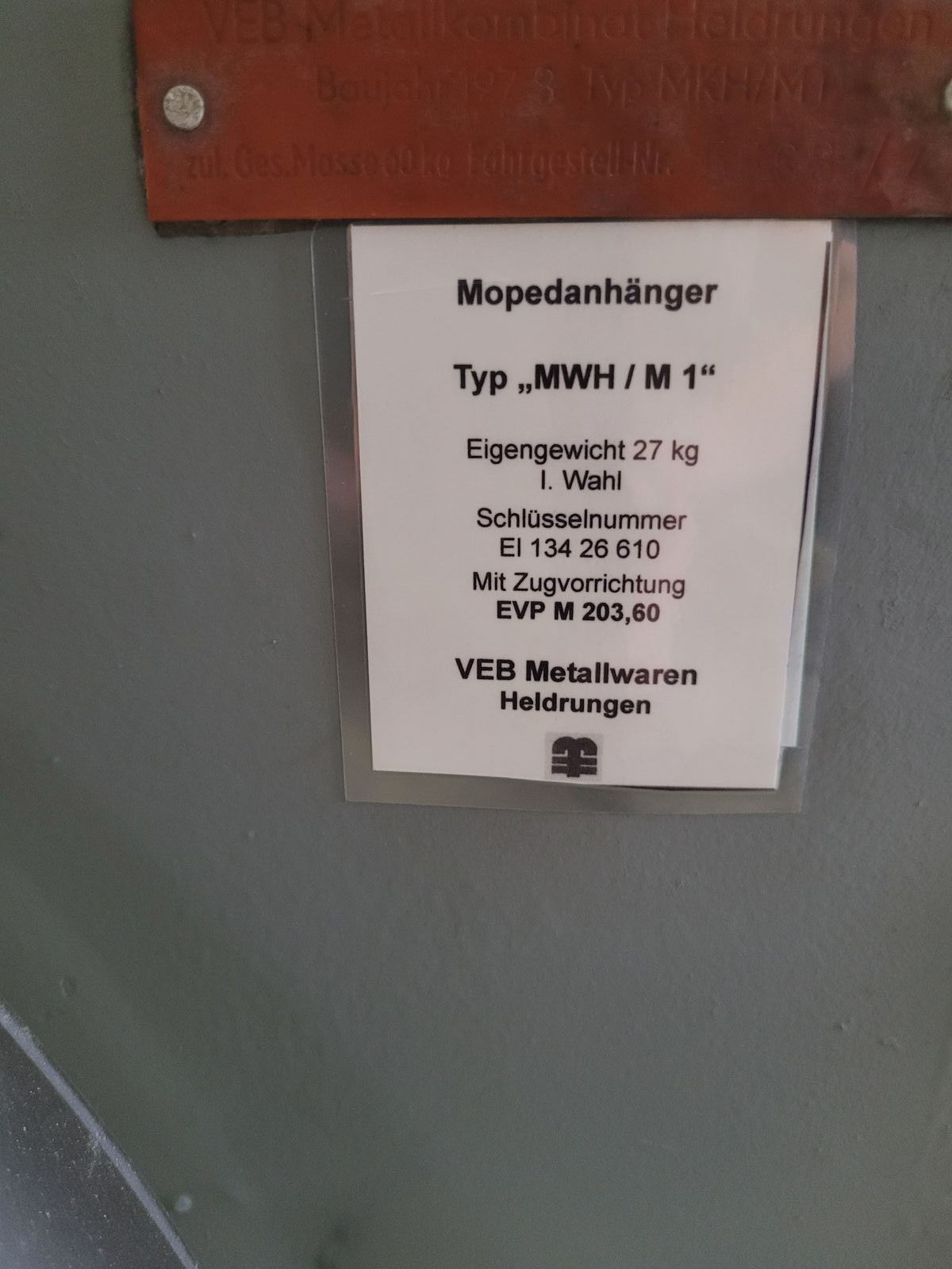 Vor einiger Zeit hatte ich mal mit meinem Schwager über etwas gesprochen was mich schon eine Weile beschäftigt hatte. Mein Wunsch war es einen originalen "Klaufix-Anhänger" zu bekommen. Am Samstag letzter Woche rief er mich an und meinte er hätte etwas für mich. Ich könne ja mal vorbei kommen wenn ich Zeit und Lust hätte. Am Sonntag schnappte ich mir meinen kleinen Oldtimer und machte mich auf den 450-Kilometer-Trip nach Sachsen Anhalt, Da die Belastungsgrenze meines 40 PS-Boliden bei 100 km/h liegt brauchte ich 5 Stunden. Als ich dort ankam zeigte sich dass sich jeder gefahrene Kilometer gelohnt hatte. Dort im Hof stand ein nicht durchgerosteter, nicht verbogener und im Großen und ganzen toll aussehender MWH/M1. Kupplung wie es sein muss vorhanden. Und zu einem Preis im mittleren zweistelligen Bereich. Lediglich die Räder hätten einen Grund zur Beanstandung geben können. Die Naben der Räder stammen vom SR2 und für die Reifen von "Pneumant" und "Heidenau", wofür ein sozialistisches Kollektiv vielleicht noch eine Auszeichnung bekommen hat. Das war mir aber in diesem Moment erstmal egal. Bei ein paar guten Flaschen "Sternburg Bier" rüsteten wir die Elektrik auf 12 Volt um, tauschten den Stecker von alt in neu und ließen den Abend ausklingen. Am Sonntag ging es dann nach dem Besuch von einigen Flohmärkten wieder in die Pfalz. Am Abend, zu Hause, angekommen gab es dann erstmal die Bestellung der AHK für den Star und zweier neuer Reifen. Hier gibt es jedoch etwas zu beachten. Man sollte nicht, wie ich "Hirni", davon ausgehen das bei bald 45 Jahren alten Reifen die Schläuche besser aussehen, Sonnst kann man, wie ich, nochmal 2 Tage warten. In der Zeit entrostete ich den Aufbau und die Schutzbleche und versah sie mit neuer Farbe, Heute waren dann die neuen Schläuche da, das Teil war in kürzester Zeit montiert , es wurde noch der obligatorische Seitenaufkleber nachempfunden und ich konnte zur ersten Probefahrt aufbrechen. Klasse, wie in meiner Jugend als ich mit dem Moped und dem Anhänger zum angeln unterwegs war. Jetzt ist mein Projekt endgültig abgeschlossen. Mal sehen was als Nächstes kommt!