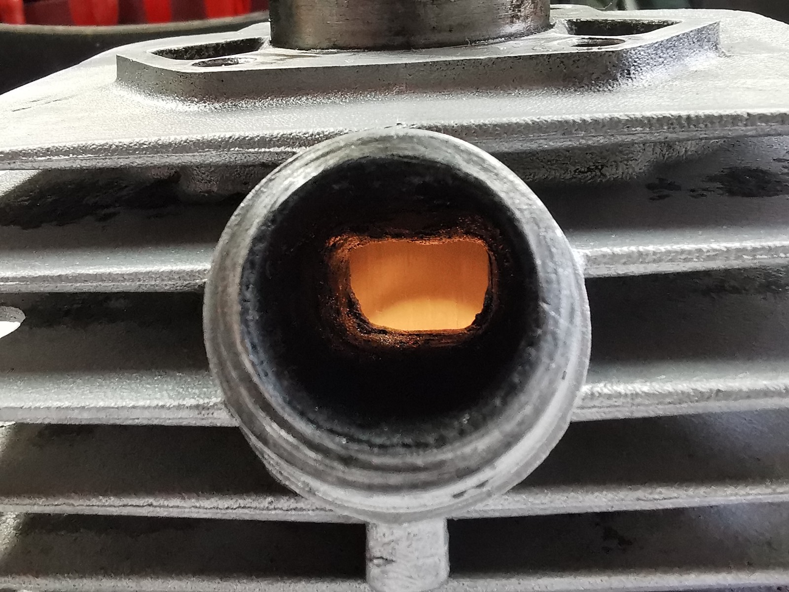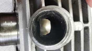 Nach Prüfung der Steuerzeiten muss ich leider feststellen, dass der Auslasskanal aufgefeilt wurde, um 4mm nach oben. Die Abgase treten demnach deutlich früher aus.