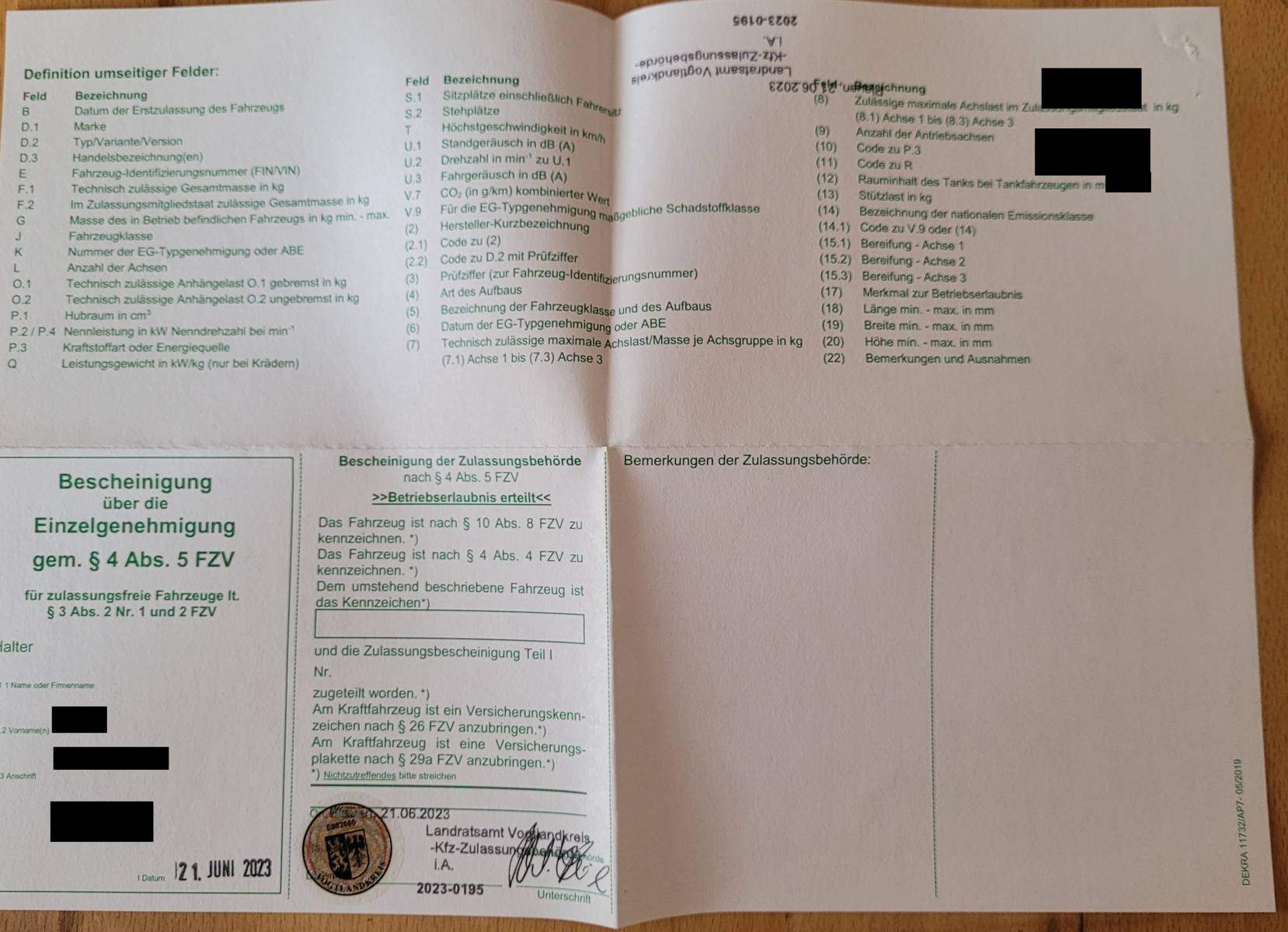 Hier der Schein. Nicht wundern die Zulassungsstelle hat den zuerst falsch herum bedruckt..