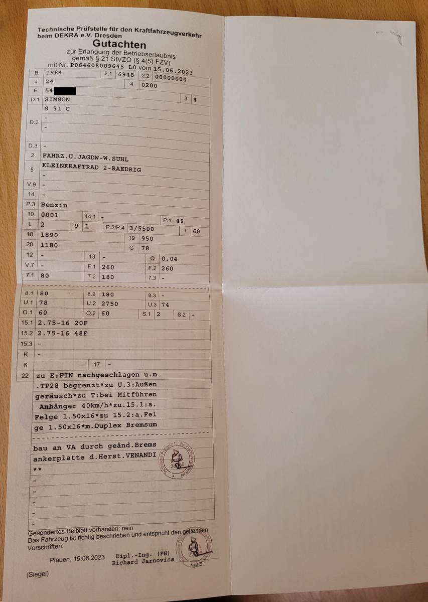 der Dekra Prüfer möchte eine Eintragung in einer Simson sehen. D.h. ein Fahrzeugschein oder Gutachten.