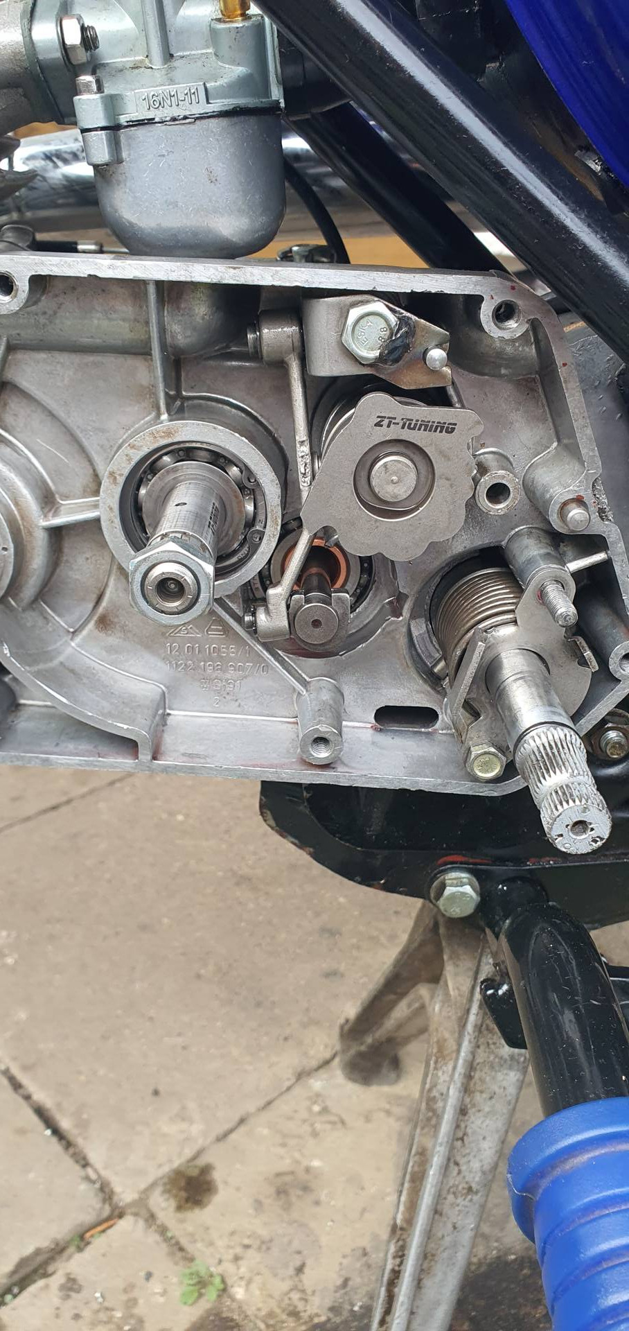 Hi Leute, ich muss mich mal an euch wenden, da ich nicht mehr weiter komme. Und zwar habe ich mir von ZT Tuning ein 5-Gang-Getriebe mit kurzen 1. Gang geholt. Habe jetzt aber große Probleme beim Einstellen. Erster und Zweiter Gang lassen sich einstellen, aber ab Gang 3 geht nichts mehr. Ich musste auch die Schlitzschraube ganz nach rechts zum Anschlag drehen, damit ich überhaupt in den ersten Gang gekommen bin. Mir ist noch aufgefallen, dass wenn ich im ersten Gang bin, dass es bei mir wie auf dem Bild aussieht. Die Schaltklaue hatte ich auch schon bearbeitet (1,5mm weggefeilt) und auch die Kontermutter hinter der Schlitzmutter am Lagerwinkel. Aber irgendwie sieht es komisch aus.