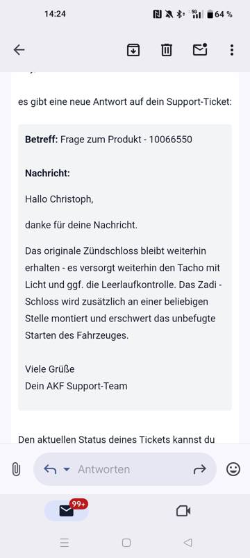 Zusätzlich wäre dann das Schalten von Dauerplus über das dünne schwarze Kabel des Zadi-Zündschlosses überfordert, da sollte die Last lieber über ein Relais fließen, das über das schwarze Kabel des Zündschlosses geschaltet wird.