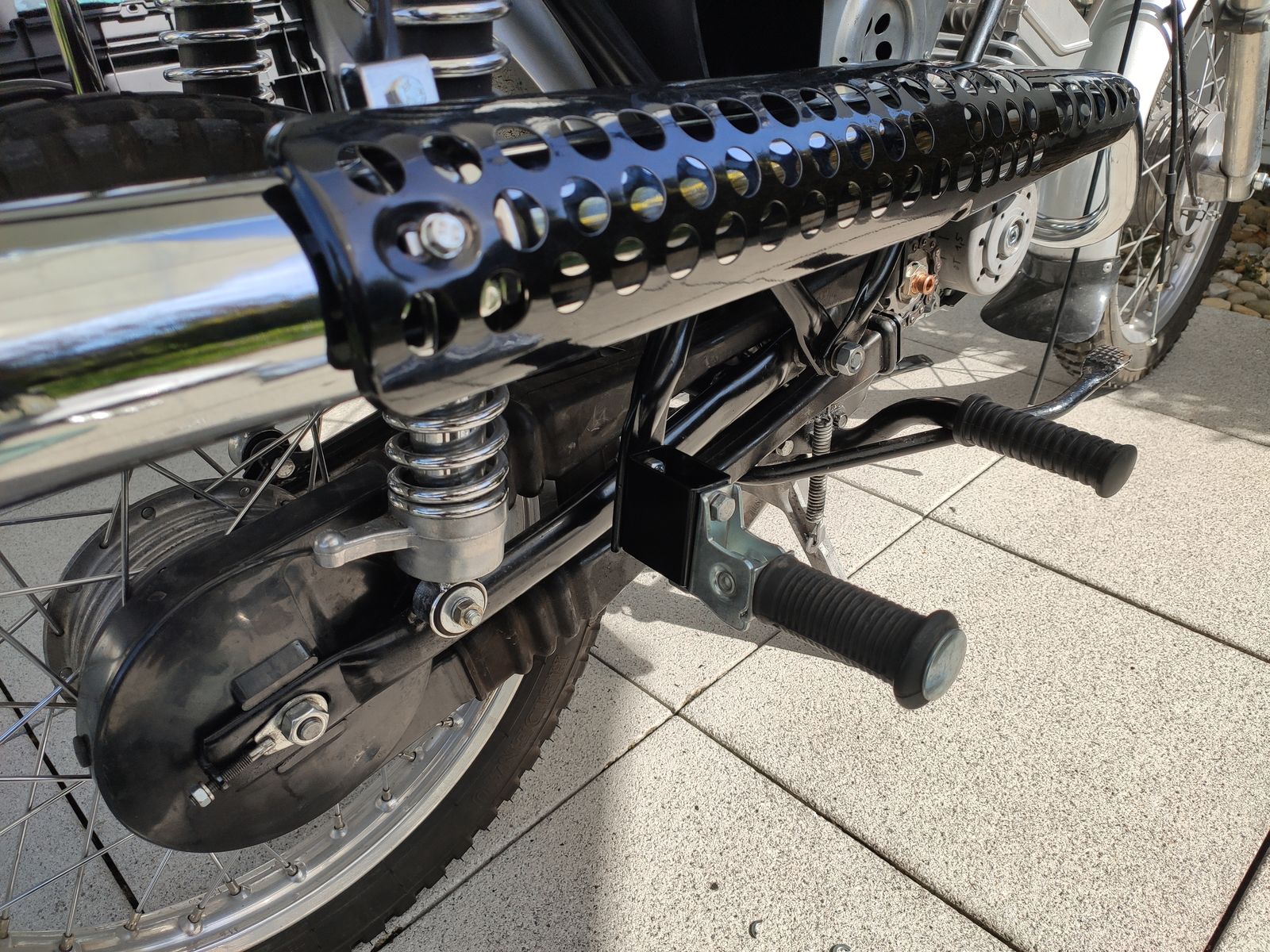 "Fußrastenverbreiterung" damit die Partnerin bequemer mitfahren kann. Schnell gemacht aus einem Stahlvierkantrohr, hat keine halbe Stunde gedauert mit anpinseln.