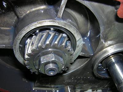 Und die KW-Lager und die Abtriebswellen-Lager gleicht man zum Schluss aus. Man lässt die Kappen mit dem Simmering erstmal ab, man schlägt die Lager richtig rein und dann legt man die Ausgleichscheiben rein bis sie bündig abschließen und dann die Dichtkappen drauf.