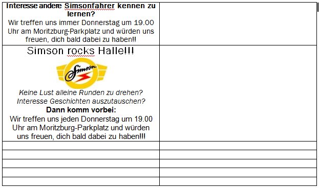klingt gut, nur sprachen wir doch nur vom ersten donnerstag jedes monats oder? also jede woche wär mir zu viel. und zusätzlich wäre der link zum thread(sprich die vollständige adresse) auf den hallensermopedtreff noch zu ergänzen