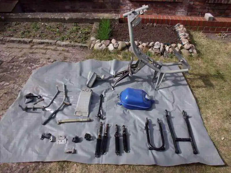 Der Rahmen und die Schwinge mit Stoßdämpfer und die anderen Anbauteile wurden dann weiß glänzend gepulvert.Das Blechkleid ist leider immer noch beim Lackierer...soll dann in cherry rot metallic lackiert werden .