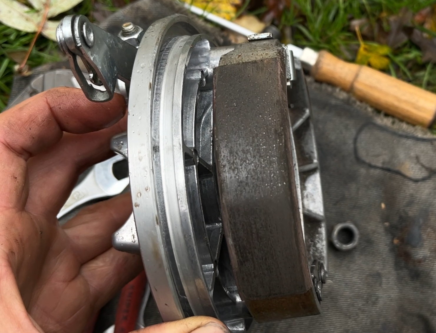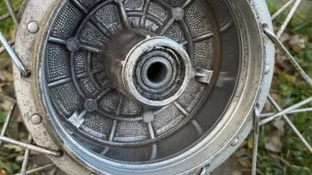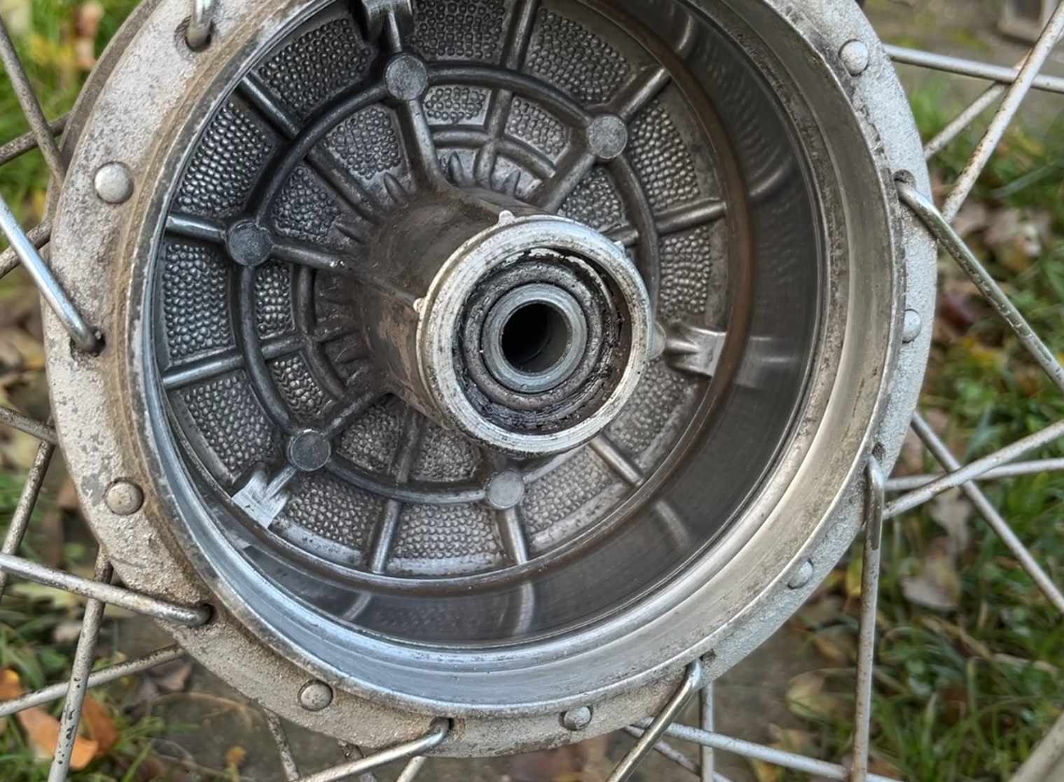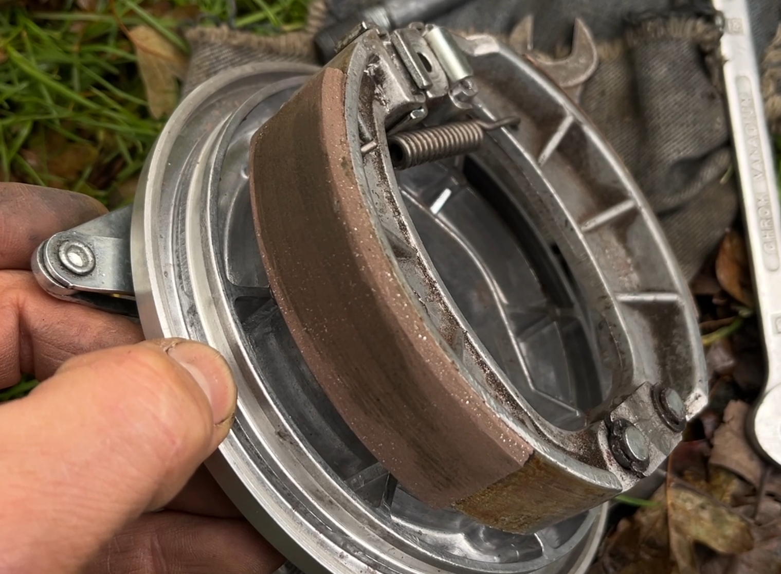Hier mal ein Foto wie das Bremsbild bei ganz leichtem Bremsen nach dem Optimieren vom Bremsnocken kommend aussah. An der Stelle hatte ich aufgehört dran herumzufeilen, die Bremswirkung war schon ziemlich gut und nach etwa 100km ist die Bremse richtig gut. Der Bremspunkt ist auch kein bisschen mehr schwammig.
