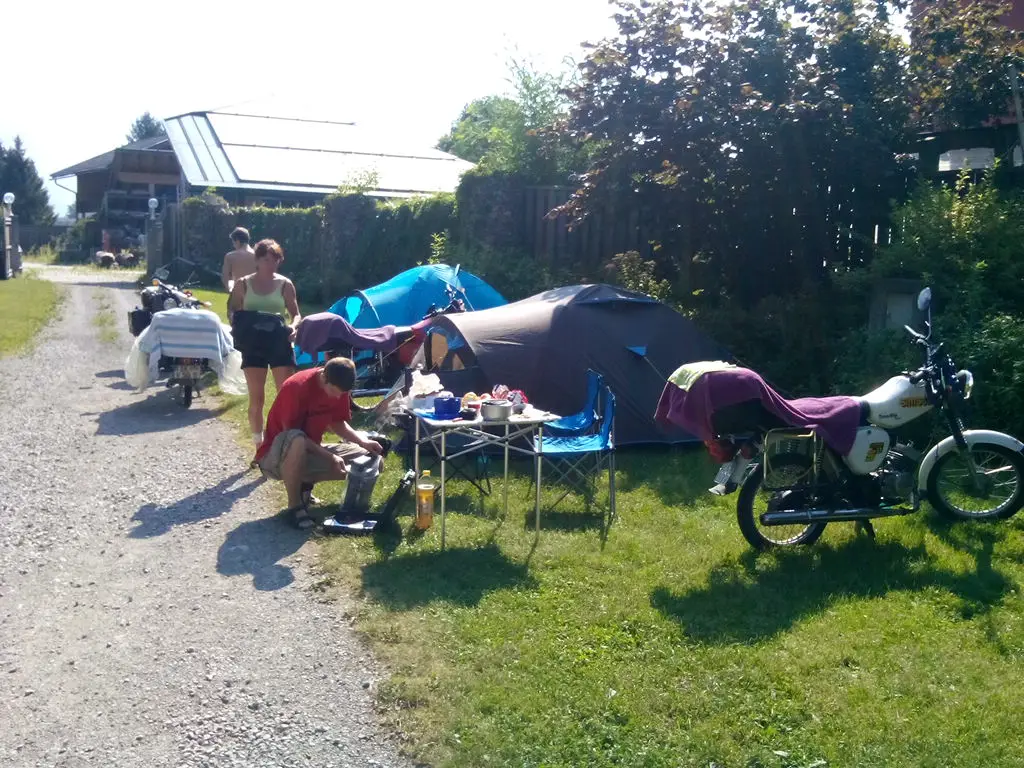 Unser Tagesziel, Lienz in Österreich, ist nur noch 50 km entfernt und so stehen wir eine Stunde später auf dem Zeltplatz. Zur Feier des Tages gönnen wir uns ein richtiges leckeres Essen in der Gaststätte - endlich wieder RICHTIGES Essen, meint Basti. Jeden Tag nur Schnell- und Notverpflegung geht einem mit der Zeit doch ganz schön aufn Keks. Die am Nebentisch sitzenden Einheimischen sorgen mit Akkordeon und Gesang für eine landestypische musikalische Unterhaltung. Auch wenn die Musik nich grad unsern Geschmack trifft, so kann mans aushalten.