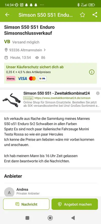 • Wird lustig für den Käufer wenn der "Mann" dann gelatscht kommt weil seine werte Gattin seine Gefährte gar nicht verkaufen durfte und sie gar nicht die Eigentümerin ist... da ist der (Ehe)krieg vorprogrammiert... :D ^^