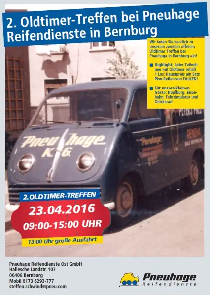 am 23.04.2016 ist in Bernburg das 2. Oldtimertreffen beim Pneuhage-Reifenservice angesetzt.