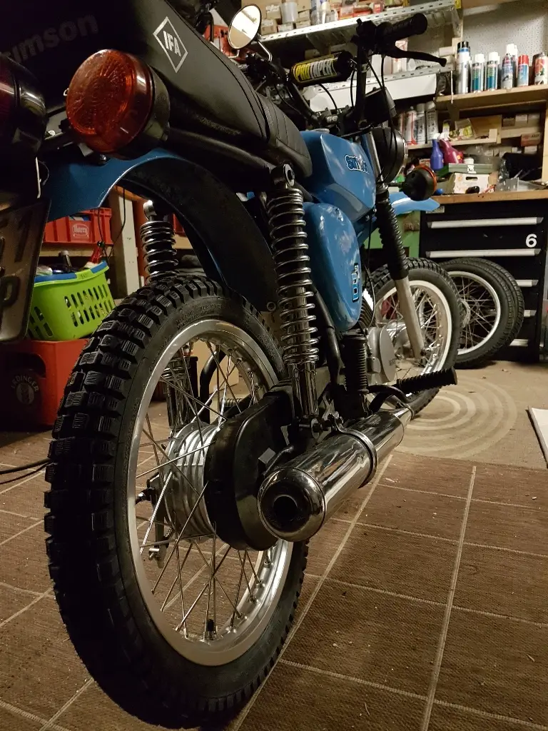 Mittlerweile ist die S50 wieder als Original unterwegs. Sogar die alten Blinker hab ich verbaut. Ok, der Lenker stimmt nicht. Und für den Spaß im Gelände hab ich mir ne verbastelte und billige S51 geholt und auf Enduro/Scrambler-Optik umgestrickt.