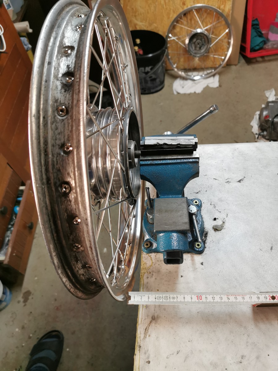 Ich weiß, daß es bei Ostoase und Co komplette Speichenräder für um die 80-120€ gibt. Mir ist aber mein altes Rad mit zur Maschine passender Patina lieber. Außerdem hasse ich es, einfach alles wegzuwerfen, besonders wegen einer Einstellungssache