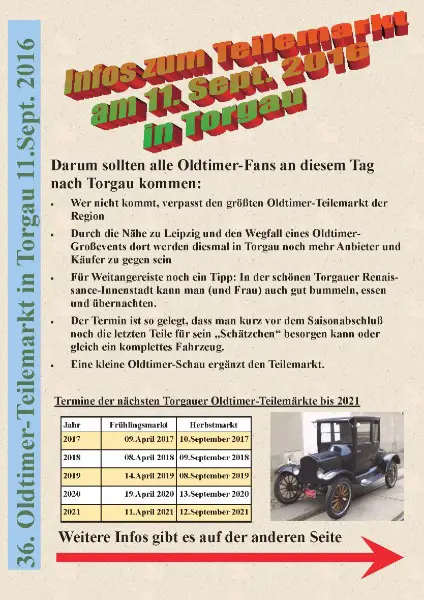 Am Sonntag, den 11.September 2016, ist es ja wieder so weit und unser inzwischen 36. Oldtimer-Teilemarkt findet in Torgau statt. Für alle Interessierten hier mal der Flyer und der Link zu der Veranstaltung:http://www.facebook.com/events/1586122285007239